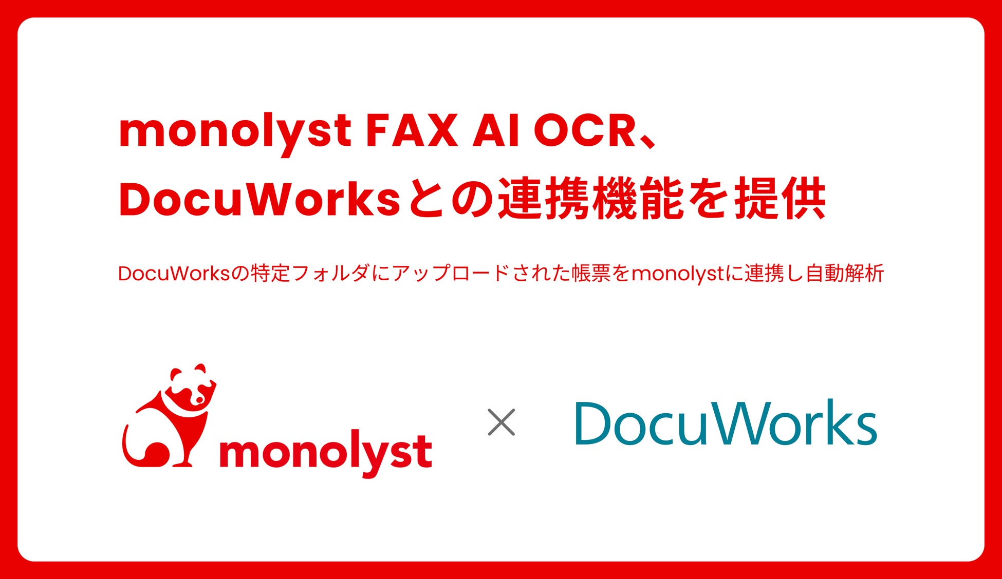 monolyst株式会社(本社:東京都渋谷区、代表取締役:伊関 洋介、以下「当社」)は、富士フイルムビジネスイノベーション株式会社(本社:東京都港区、代表取締役社長・CEO:浜 直樹、以下「富士フイルムBI社」)が提供するドキュメントハンドリングソフトウェア「DocuWorks」と連携する新機能「DocuWorks連携 for monolyst」をリリースいたしました。本機能により、DocuWorks Desk内の特定フォルダにアップロードされた帳票を、monolystに自動で連携し、AI解析します。これによって、DocuWorks導入企業におかれましては、引き続き全社の帳票管理基盤としながら、monolyst FAX AI OCRを通じて受注業務のDXを推進できます。