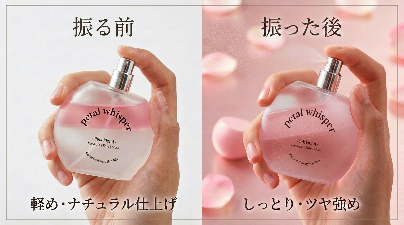 2層式の「パフューマリーヘアミスト ペタルウィスパー」は、シーンに合わせて仕上がりを楽しめるのも魅力です。