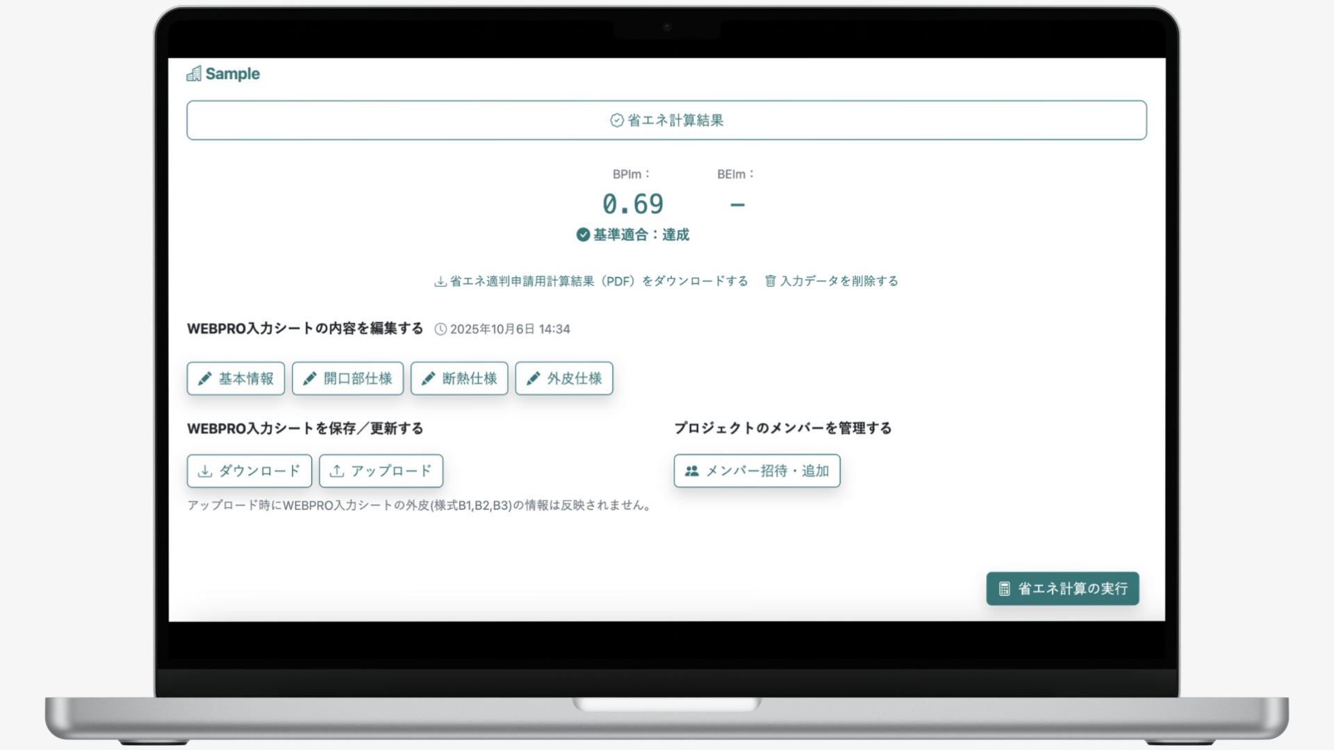 本サービスは、非住宅建築の省エネ計算をサポートする無料のWebサービスです。BIMや専門的な省エネ計算の知識がなくでも利用できるように、入力画面がデザインされています。設計案の作成段階でWebブラウザに建物情報を入力するだけで外皮性能(BPIm)をシミュレーションでき、省エネ適判申請に必要なExcelファイル(WEBPRO入力シート)の作成まで支援します。設計案の作成段階で性能を「見える化」することで、手戻りを大幅に抑えられます。