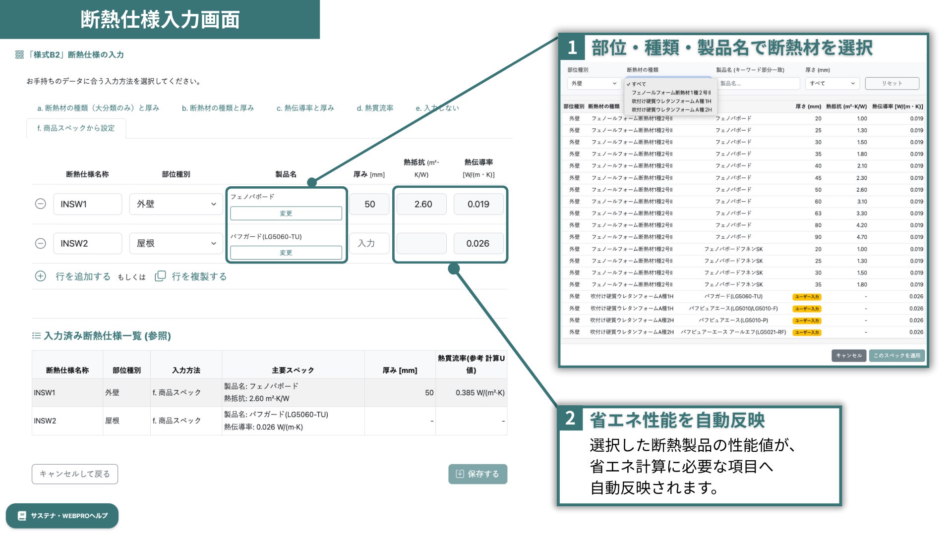 断熱材の選定に際しては、施工可能な部位、材料区分、必要熱抵抗値(R値)、断熱厚などの複合条件が関係します。今回の連携では、断熱入力画面で下記の技術的絞り込みが可能となりました。