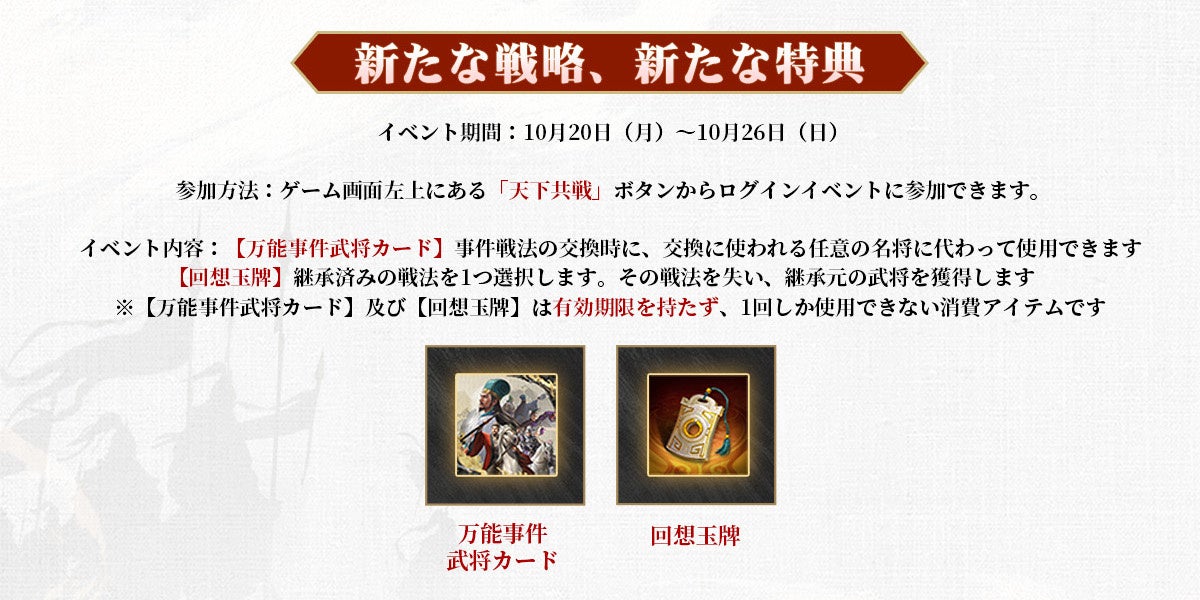 さらに、君主の皆様が「回想玉牌」と「万能事件武将カード」を入手できます。普段手に入らない貴重なアイテムを獲得できる絶好の機会、ぜひお見逃しなく。