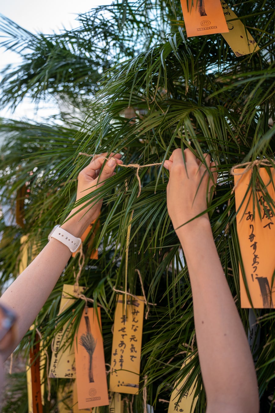 来場者数200万人達成を記念したイベントの一環として、来場者は願いごとをUAEパビリオン特製の短冊に記し、パビリオン屋外の特設スペースに飾りました。UAEパビリオンでは、七夕を願いや希望、夢を短冊に託し、竹に結んで空へ願いを届ける日本の伝統文化として敬意をもって取り入れました。象徴であるナツメヤシにちなみ、竹の代わりにヤシの葉を使用。多くの人々の願いが結ばれた前庭は、夢と想いが交差する美しい風景へと生まれ変わりました。