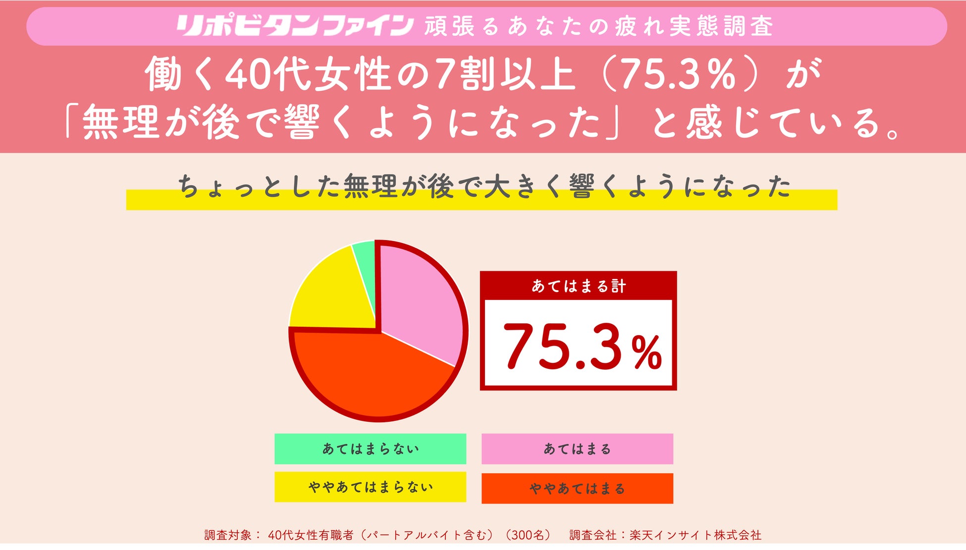 同じく働く40代女性に対しての質問で「ちょっとした無理が後で大きく響くようになった」にあてはまると回答する方が75.3%となりました。