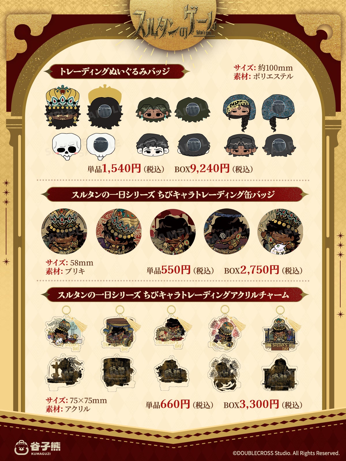 今回お届けするのは、KUMATOYS自社ブランド「KUMAGUZI」より『スルタンのゲーム』の第三弾「スルタンの一日」シリーズ新規描き下ろし商品です!いよいよ、皆様をスルタンの一日へご招待!スルタンの日常をテーマにした新商品の販売に加え、ACGXStoreで購入特典もご用意しております。