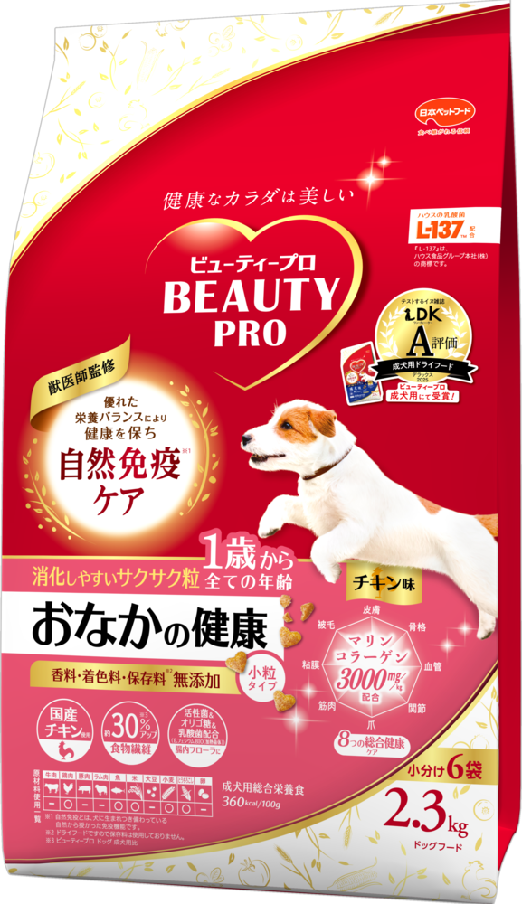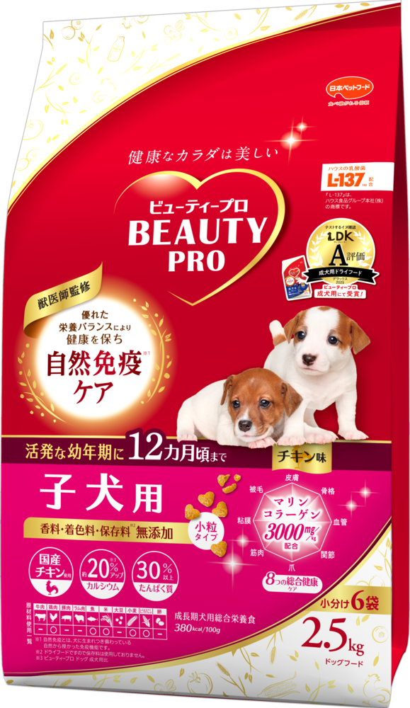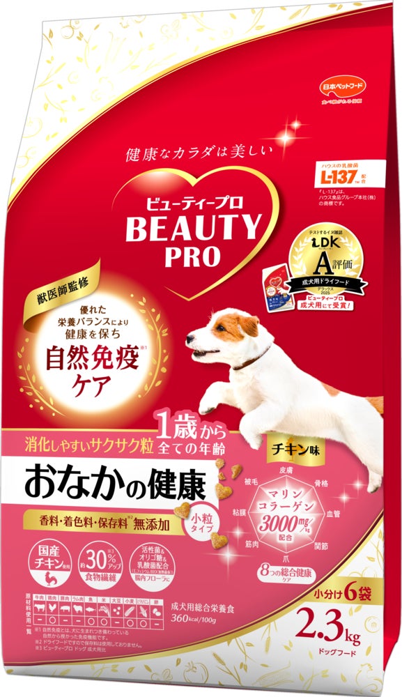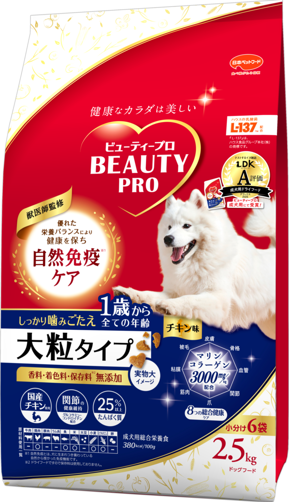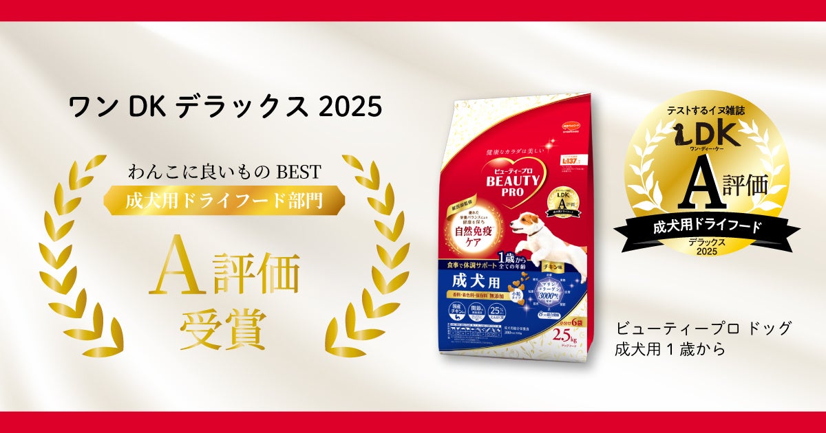 雑誌「LDK」の犬版『ワンDKデラックス2025 わんこに良いものBEST』で、「ビューティープロ ドッグ 成犬用 1歳から」が 成犬用ドライフード部門でA評価を受賞しました。