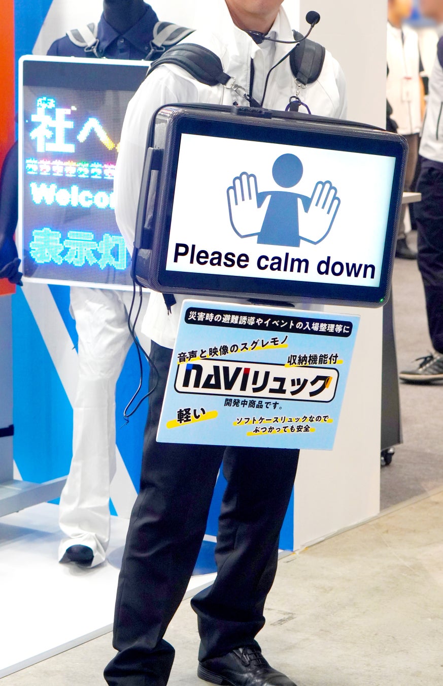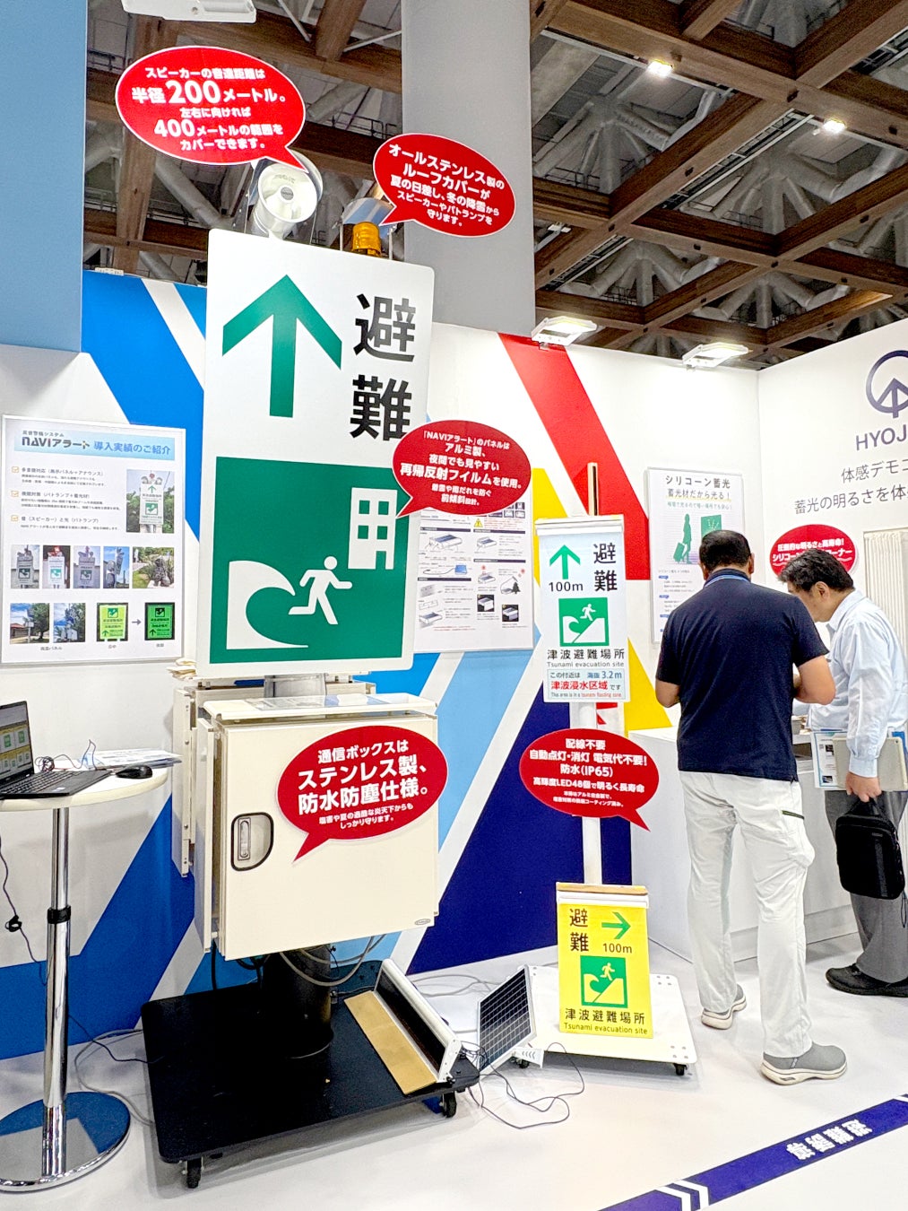 当社は、防災分野における企業ブランドならびに災害警報システム「NAVIアラート」の認知向上を目的として出展。ブースでは、沖縄県石垣市にも導入された多言語対応の災害警報システム「NAVIアラート」の実機を展示し、パソコンやスマートフォンからの簡単な操作で即時に発信される様子を発報デモとして紹介しました。また、災害避難所等をターゲットとしたスマートフォンの充電管理システムや、防滑製品、夜間にも視認性を確保できる蓄光素材の体験コーナー、さらには移動しながら情報発信が可能な「Naviリュック(開発中)」など、地域の安心・安全を支える多様な防災ソリューションを展示いたしました。