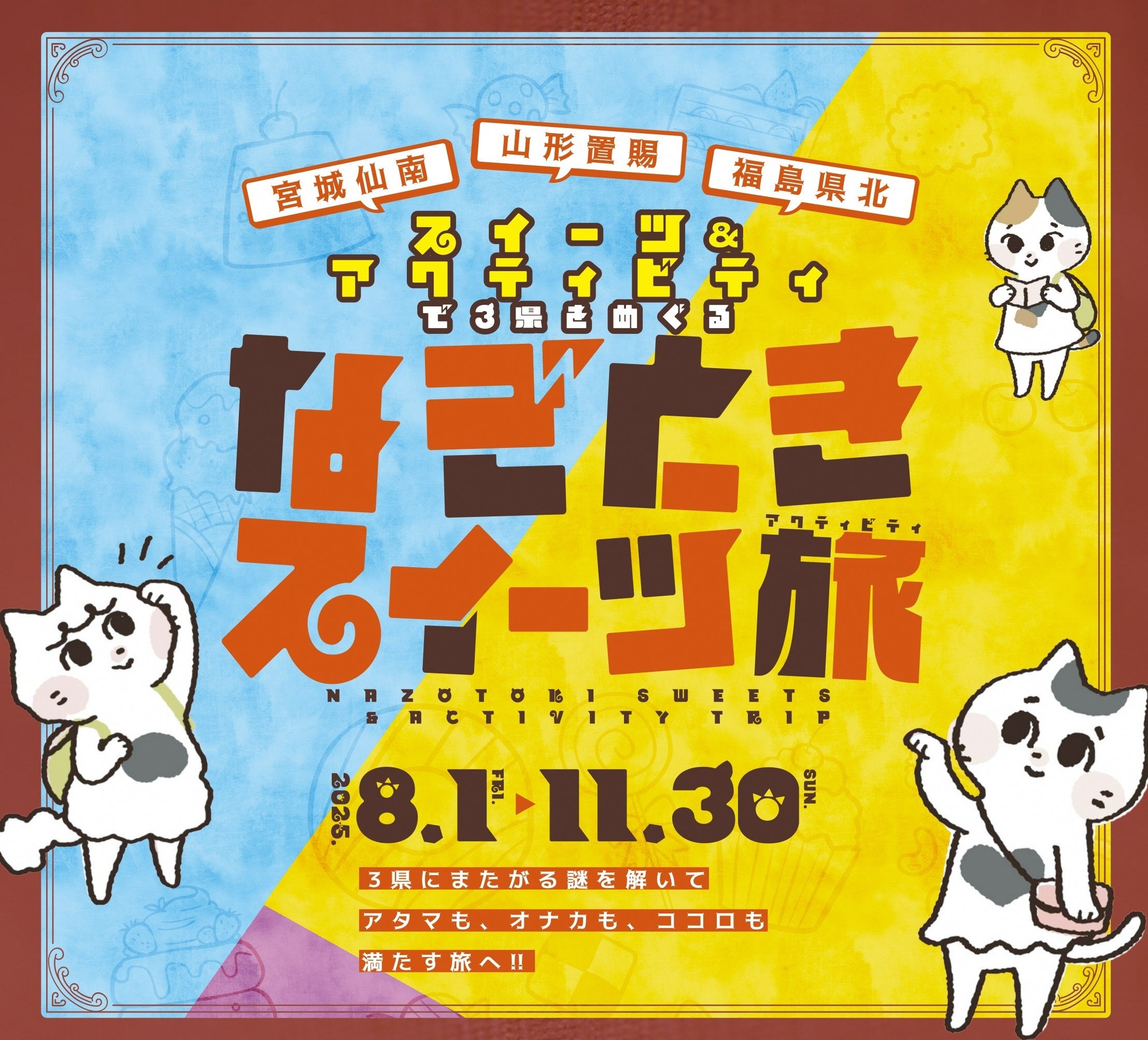 令和7年8月1日から11月30日までの4か月間、宮城県仙南地域、山形県置賜地域、福島県県北地域の南東北3地域が連携し、周遊イベント「なぞときスイーツ旅」を開催中です。本イベントは、各地域のスイーツ店やアドベンチャー施設を巡りながら謎解きを楽しむ周遊型企画で、地域間交流の一層の促進と観光需要の喚起を目的としています。