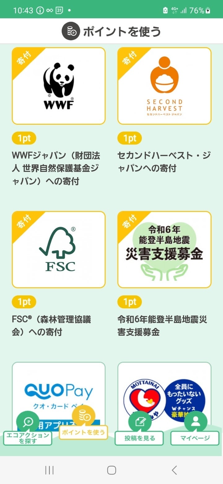 また、能登半島地震災害支援募金に加え、WWFやFSC®(森林管理協議会)などの慈善団体への寄付もポイント交換商品としてご用意しています。加えて、環境配慮型商品や各種電子マネーなど、幅広い商品ラインナップを取り揃えており、今後も会員の皆様がエコアクションに取り組む際の励みとなるよう、魅力的な商品や選択肢の提供にも努めてまいります。