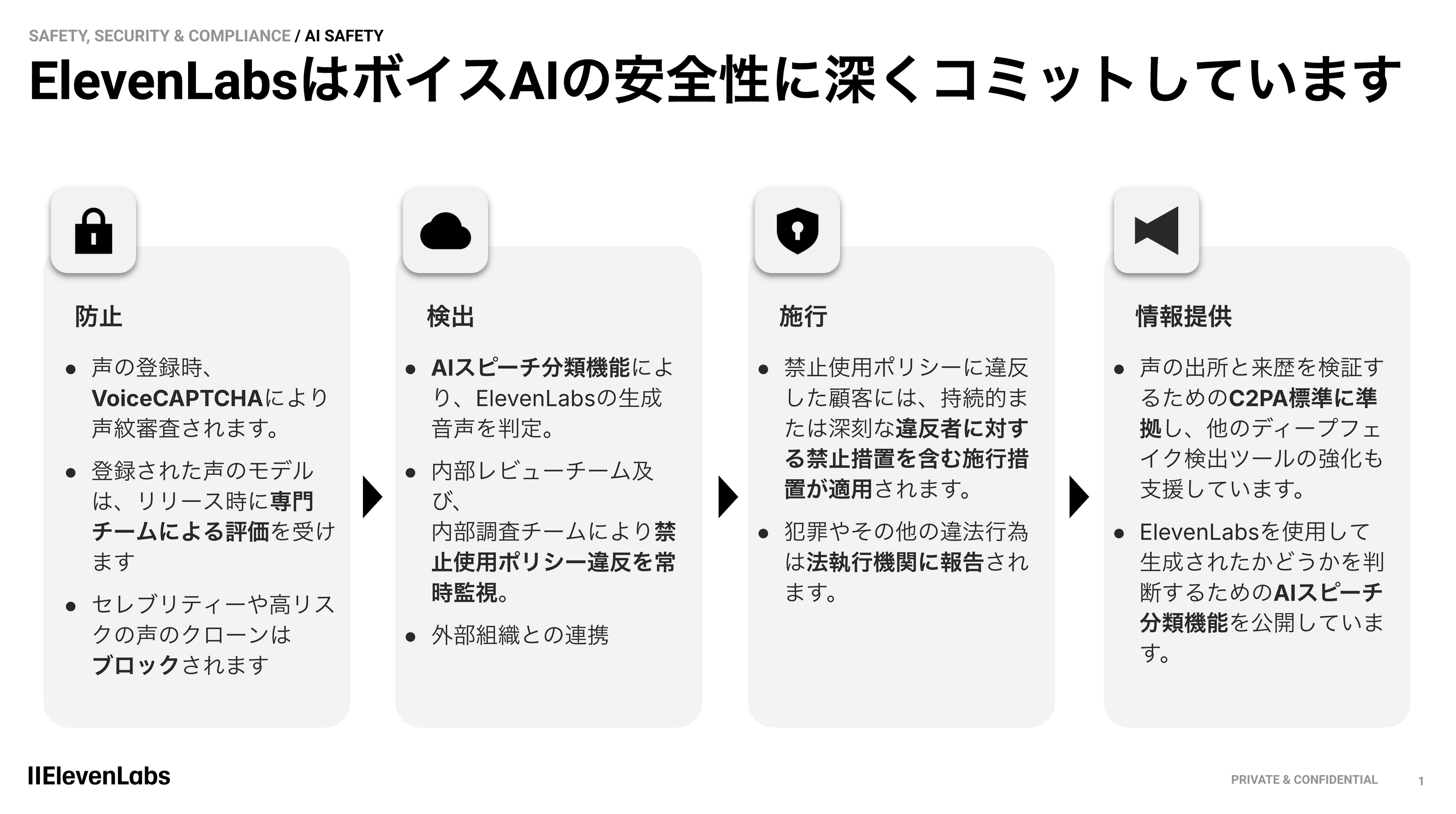 万が一、イレブンラボを通じて生成されたコンテンツで不正な利用が発生した場合、デジタル透かしとその検知機能(AI Speech Classifier)を分析することで、音声の出所を迅速に追跡・特定し、関係機関と連携できる体制を確立。 |
