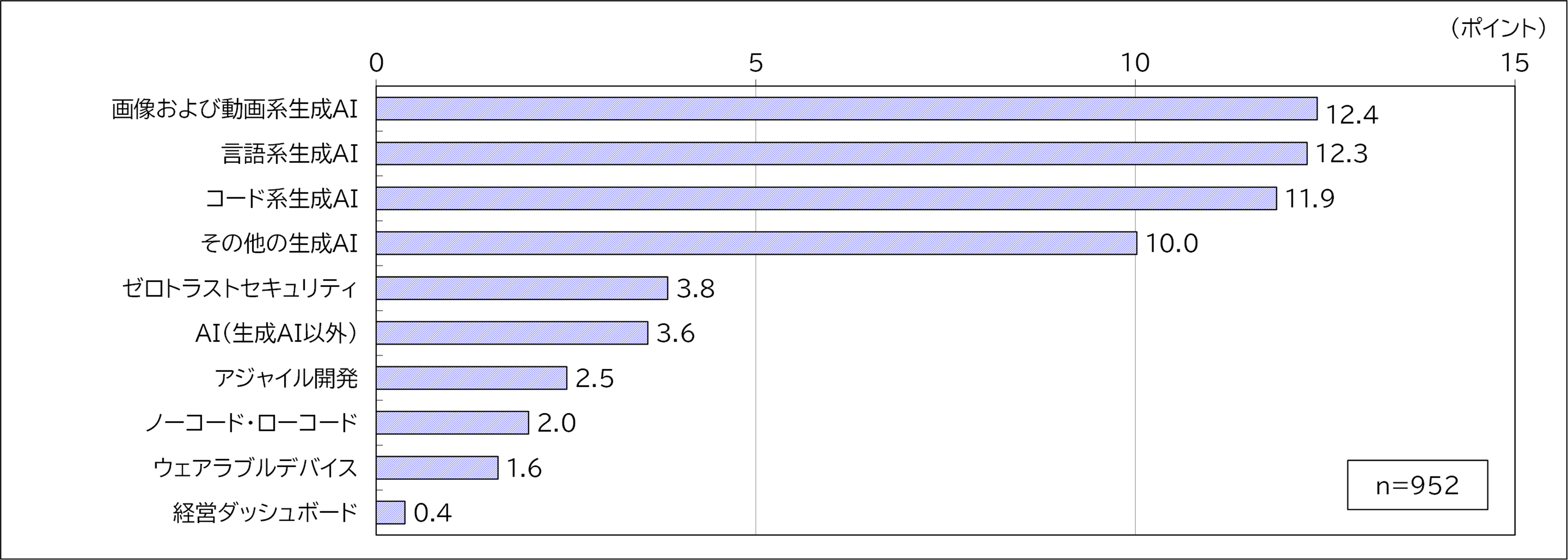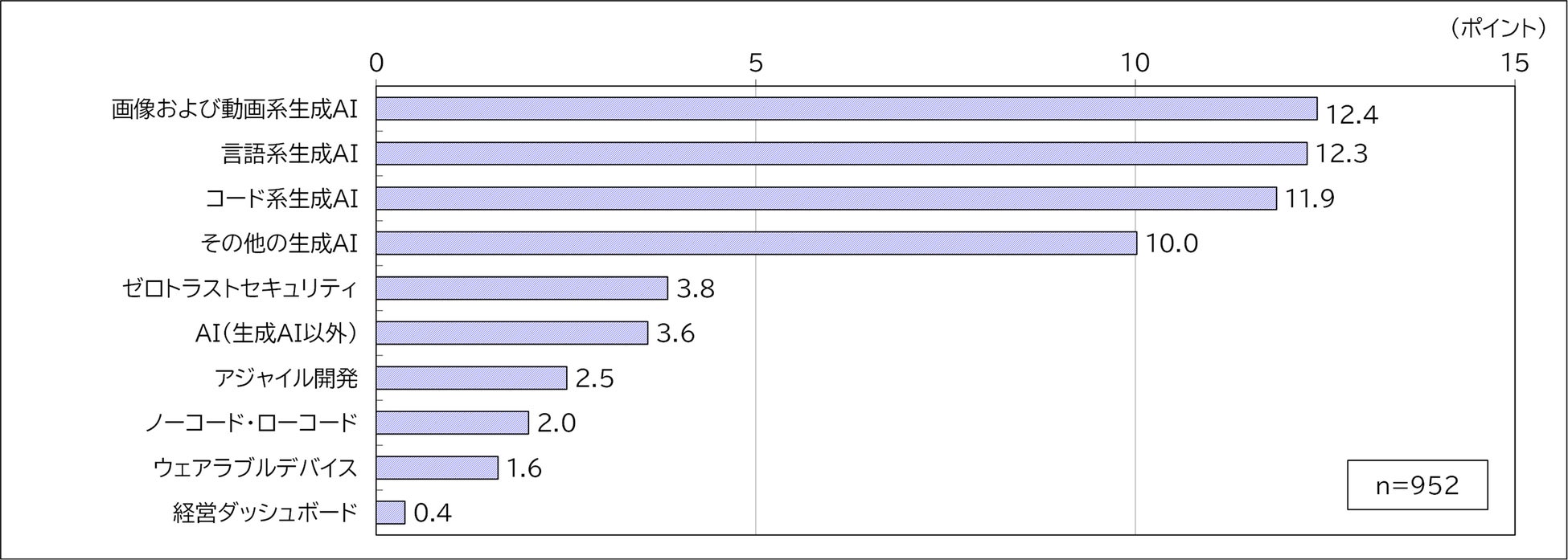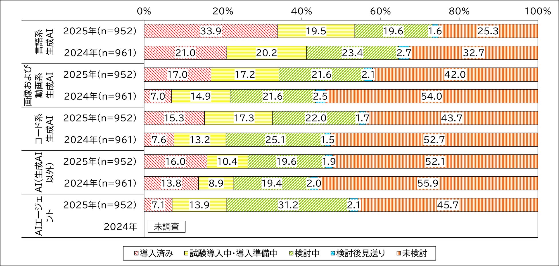 生成AIの活用領域の多様化も進んでいます。「言語系」にとどまらず、「画像および動画系生成AI」の導入・試験導入が34.2%、「コード系生成AI」が32.6%と、それぞれ前年度から10ポイント以上の大きな伸びを示しました。生成AIの活用は、テキスト処理からシステム開発やクリエイティブ領域へと着実に裾野を広げています。(図1、3)