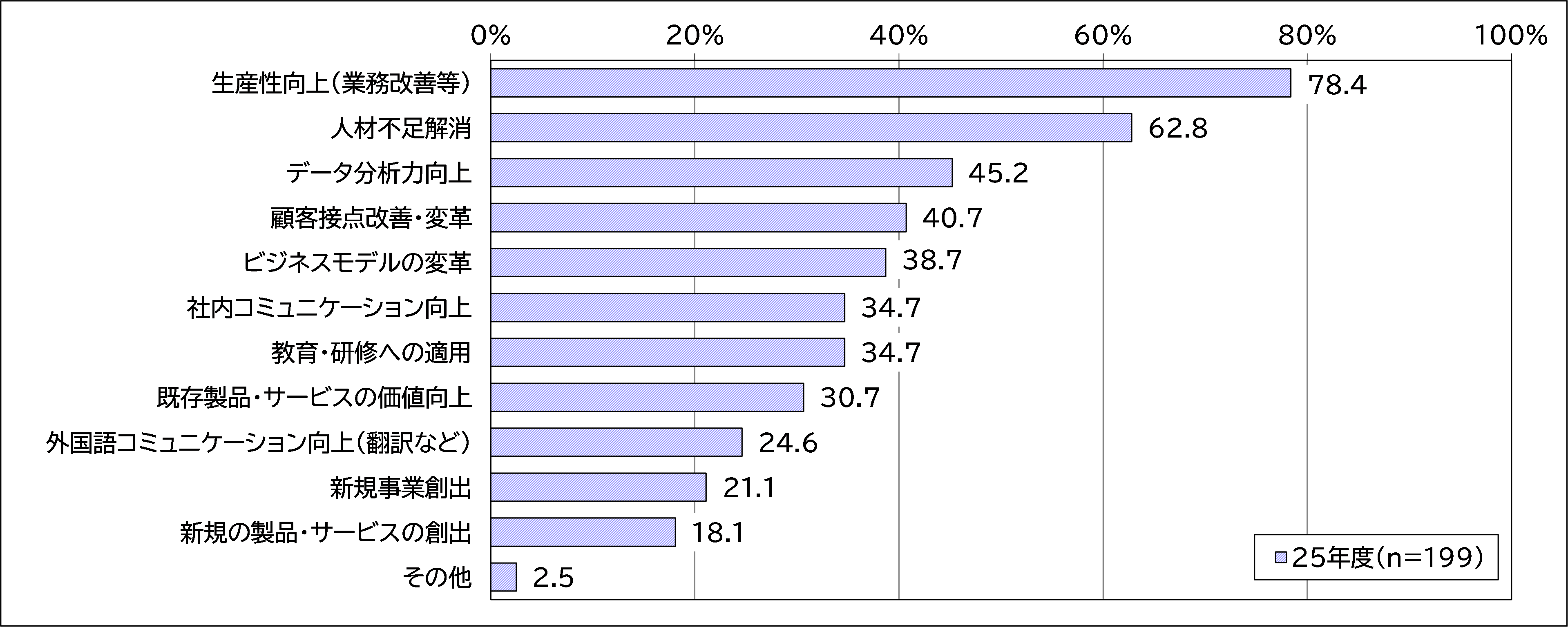 AIエージェントの導入検討の目的として、「生産性向上」のほか、「人材不足解消」への期待が高く表れています。労働力不足という構造的課題に対する新たな解決策として、企業が強い期待を寄せていることが推察されます。(図5)