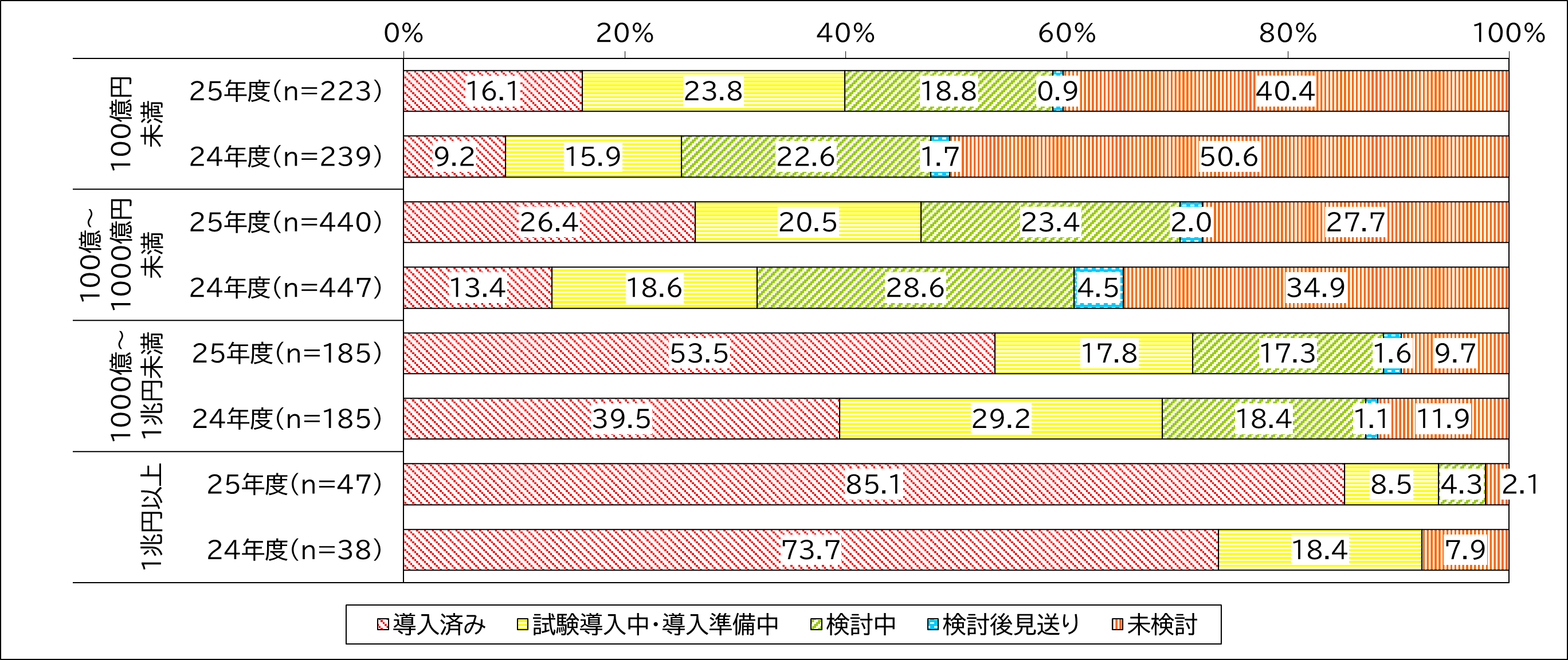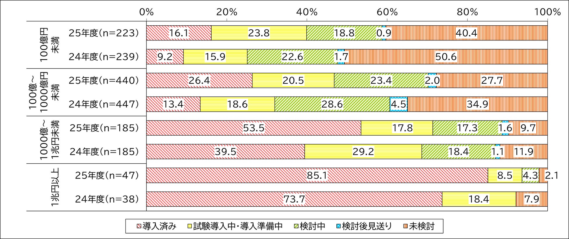 特筆すべきは売上高1兆円以上の大企業であり、「導入済み」の割合のみで85.1%に達し、すでに業務において必須のツールとなっていることがうかがえます。(図2)