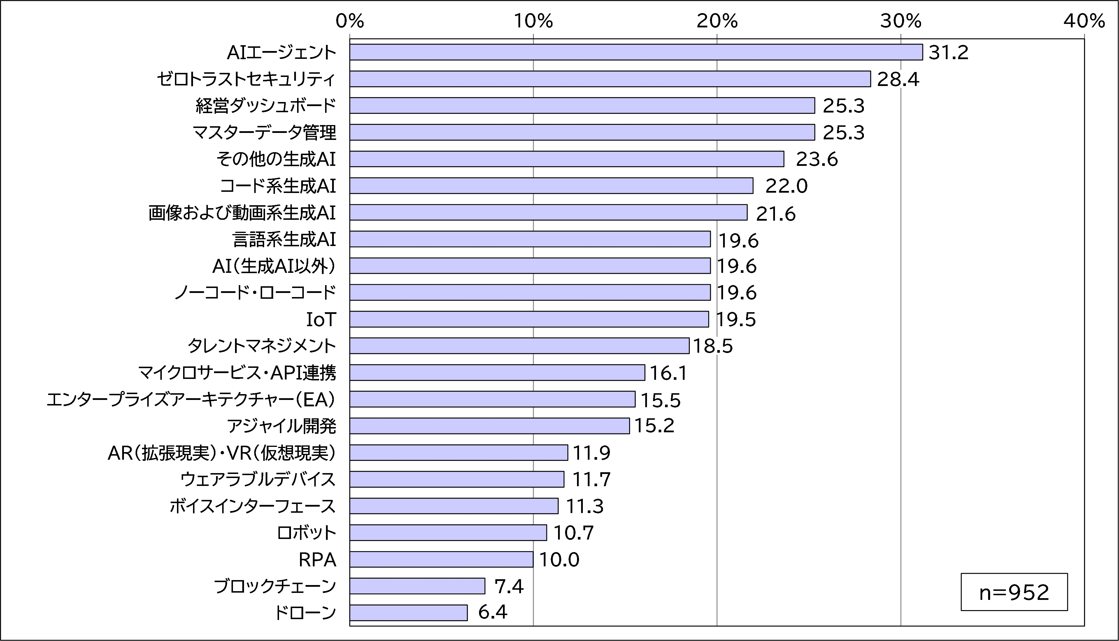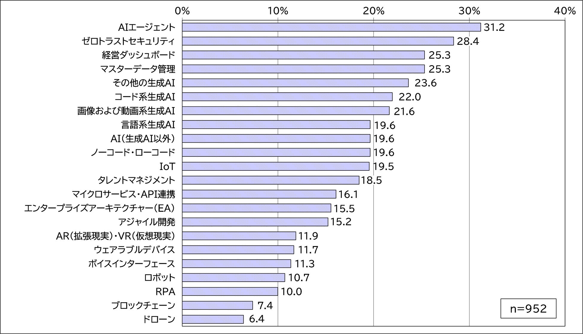 生成AIの活用領域の多様化と合わせて進みそうなのが、AIの自動化・自律化です。本調査では、新規テクノロジーへの関心度を測るために、様々なテクノロジーの導入状況を尋ねています。今回の調査から「AIエージェント」を選択肢として追加したところ、導入を「検討中」と回答した企業の割合が最も高い31.2%でした。(図4)