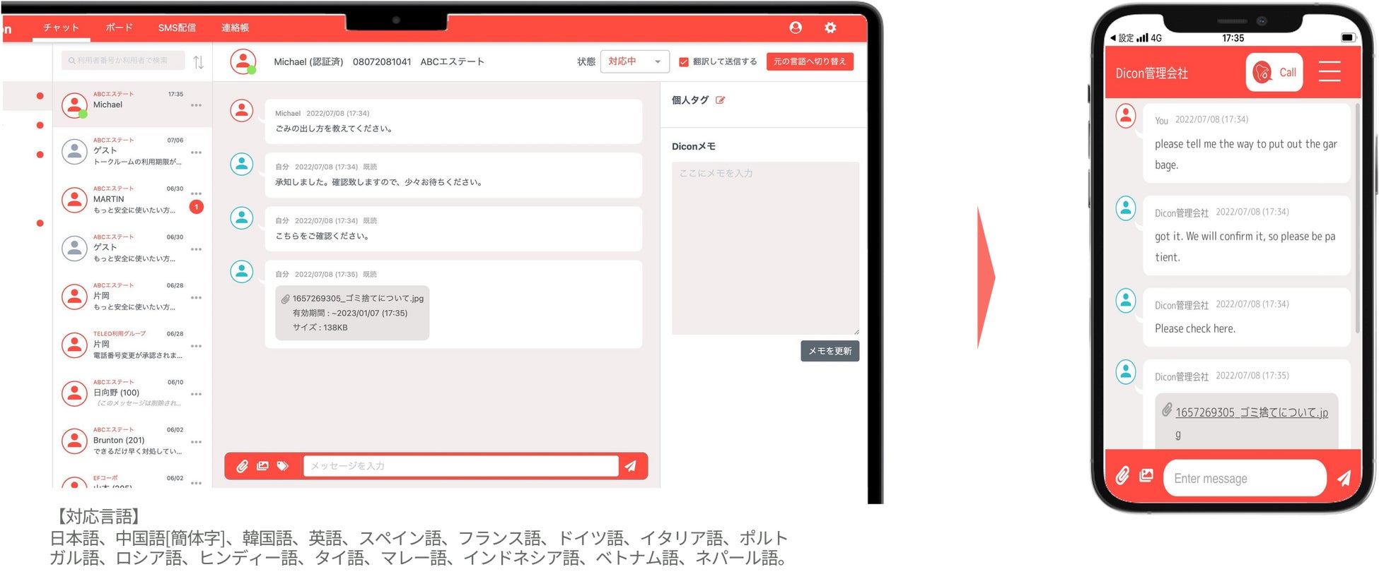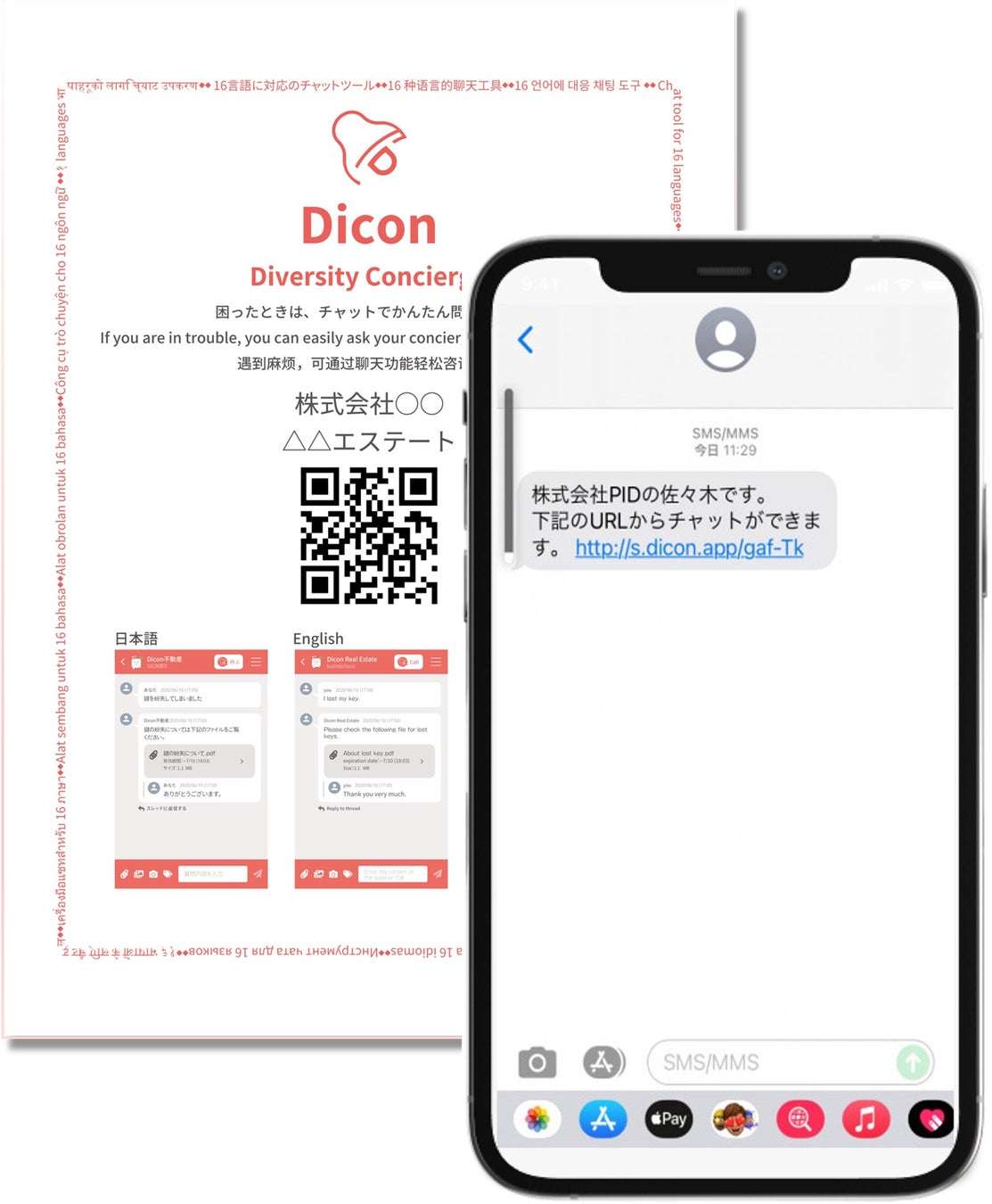 「Dicon」は、不動産賃貸管理業務における多言語対応コミュニケーションを効率化するためのクラウドサービスです。アプリ不要・自動翻訳・履歴管理といった機能により、「言った・言わない」の防止や情報共有のミスを最小限に抑え、不動産管理会社の皆様の働き方改革と生産性向上を支援します。