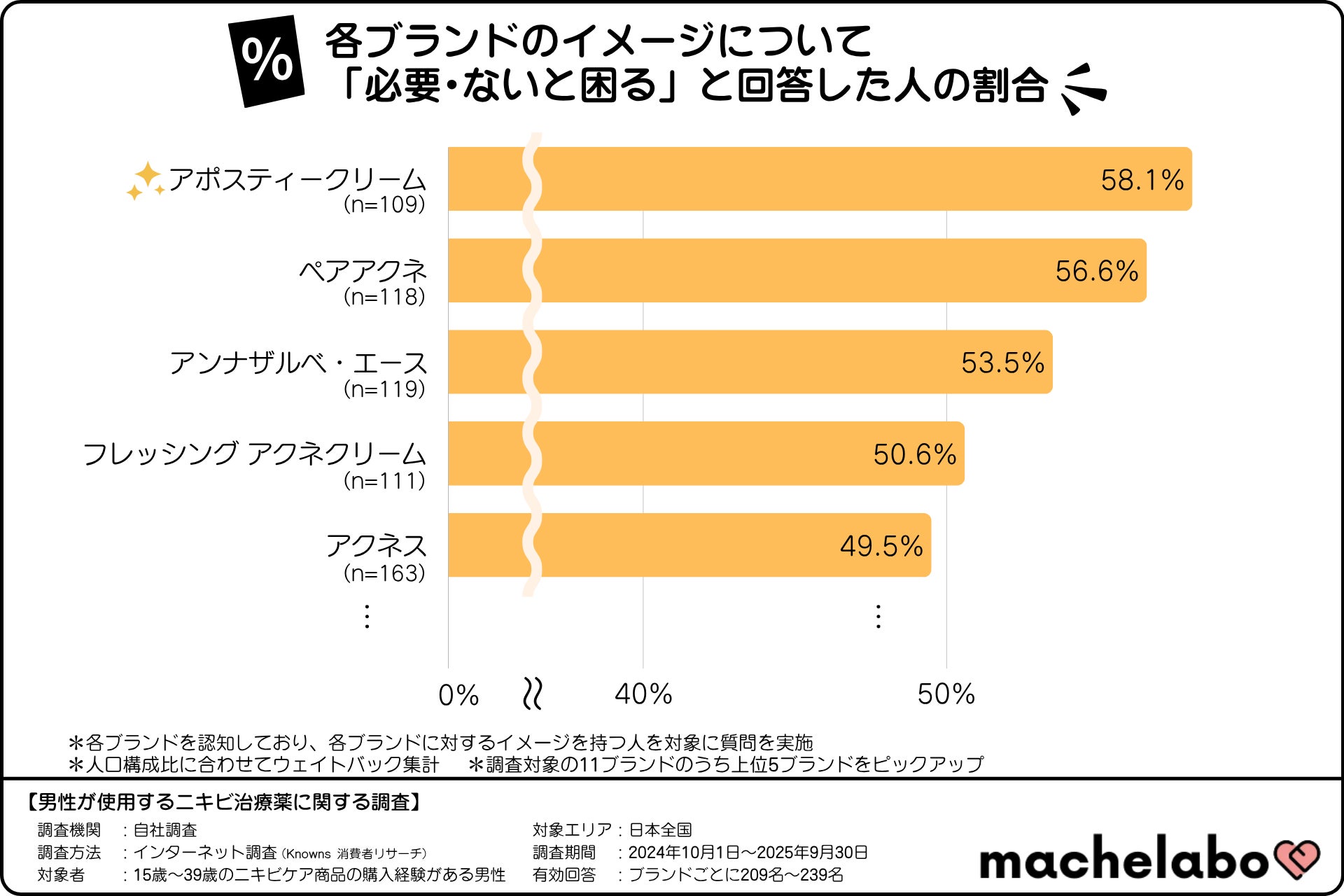 「アポスティークリーム」について、「必要・ないと困る」というイメージを持っていた人の割合は58.1%でした。これに続いて、「ペアアクネ」(56.6%)、「アンナザルベ・エース」(53.5%)も高い支持を集めており、多くのブランドがユーザーの日常に欠かせない存在となっていることが伺えます。