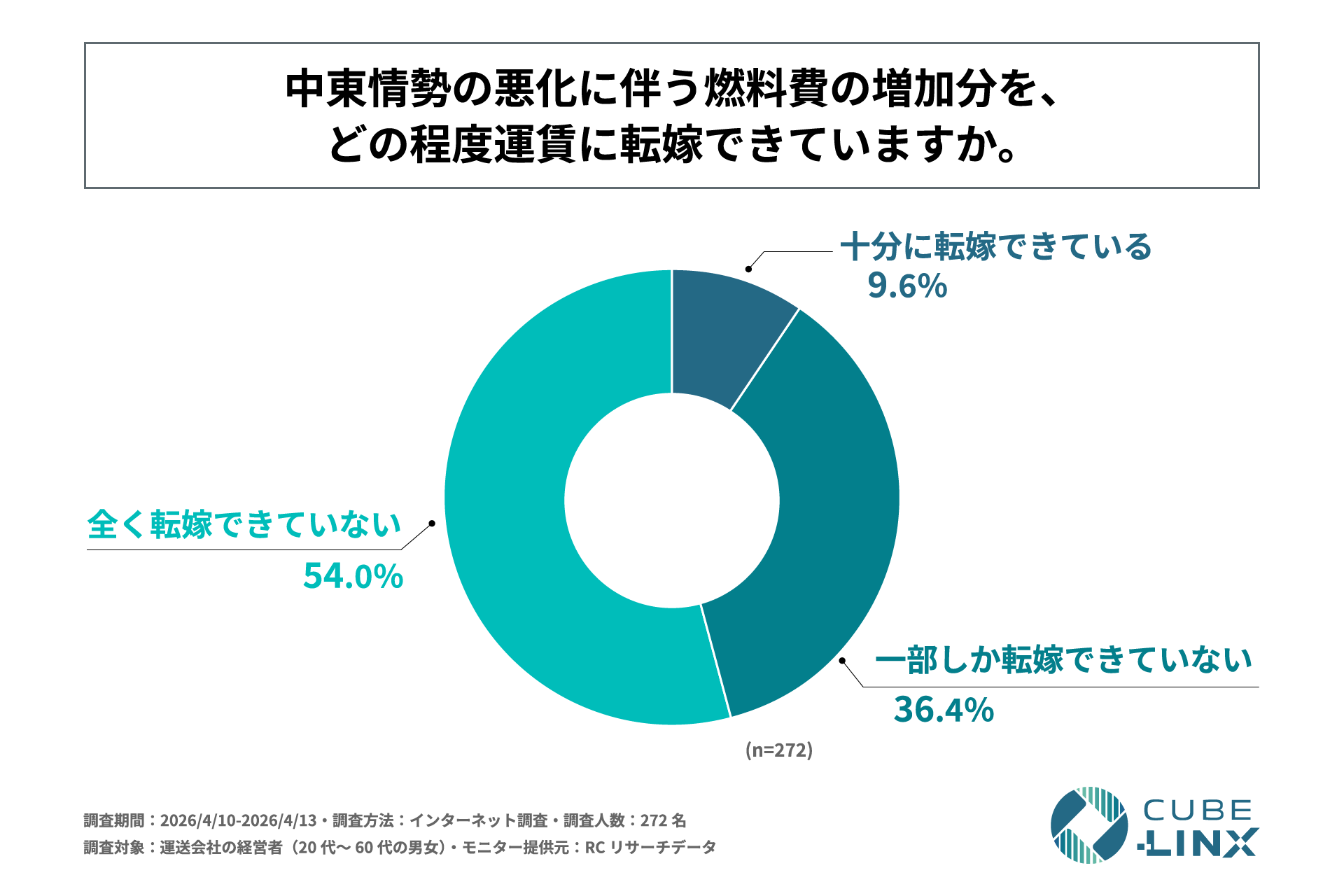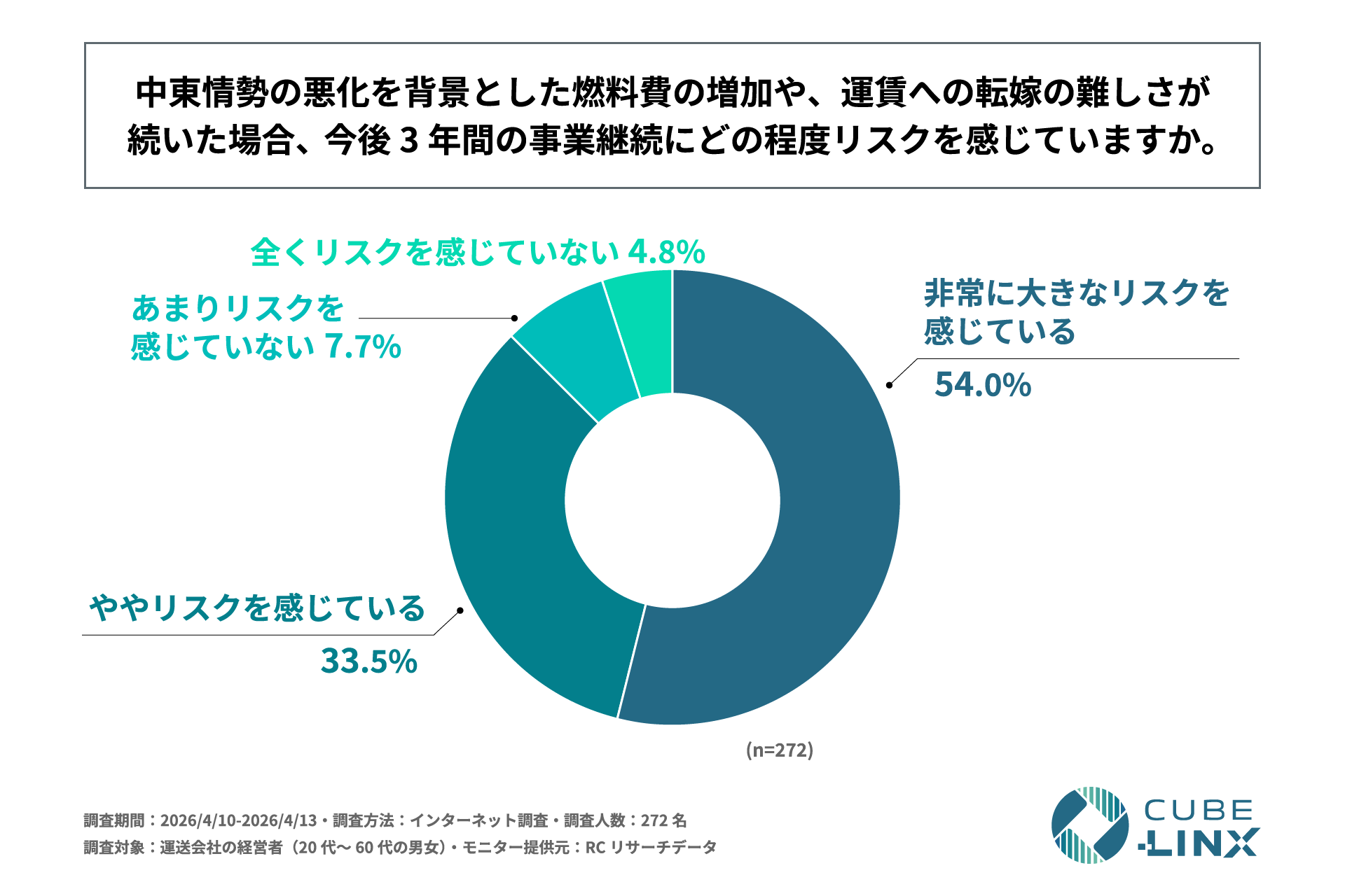 電動車及び付帯設備の導入支援事業を展開する株式会社CUBE-LINX(本社:東京都日野市、代表取締役:桐明 幹)は、運送会社の経営者(20代~60代の男女)を対象に「中東情勢悪化による燃料費増加が運送業界へ与える影響に関する調査」を実施しました。この調査から、運送会社の経営者における、燃料費増加分の運賃への転嫁の実態や事業継続への危機感、価格転嫁を進める上での課題などが明らかになりました。