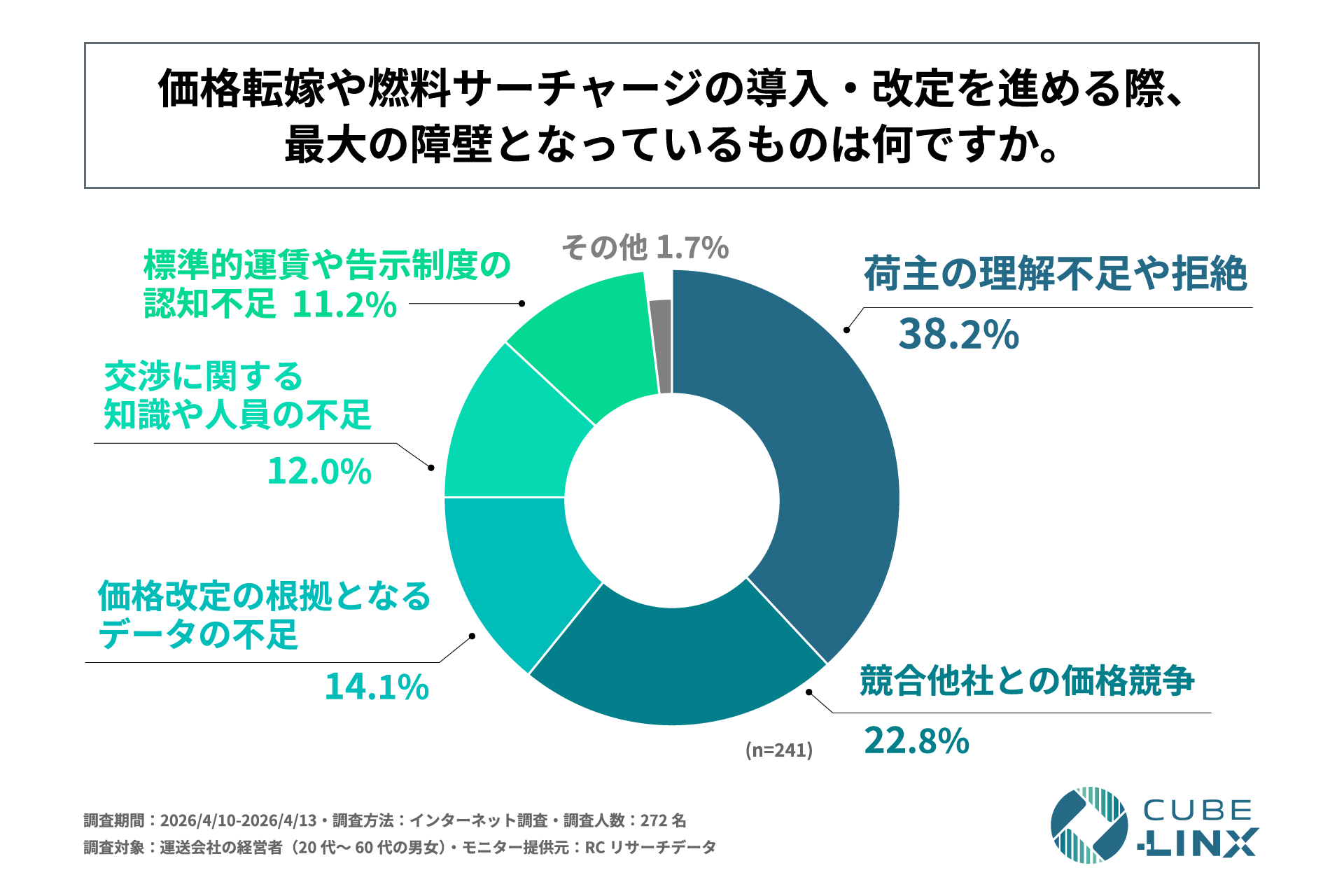 また、価格転嫁や燃料サーチャージの導入・改定に向けて何らかの取り組みを検討・実施している経営者を対象に「価格転嫁や燃料サーチャージの導入・改定を進める際、最大の障壁となっているものは何か」を尋ねる設問への回答では、1位が「荷主の理解不足や拒絶」で38.2%、2位が「競合他社との価格競争」で22.8%、3位が「価格改定の根拠となるデータの不足」で14.1%という結果になりました。この結果から、価格転嫁や燃料サーチャージの導入・改定を進める際に最大の障壁となっているものは「荷主の理解不足や拒絶」であることがわかりました。