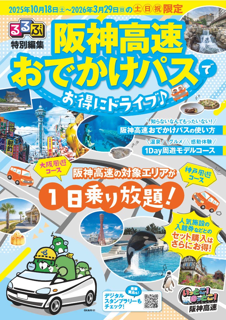 さらに、パスの使い方や周遊モデルコース等を紹介した≪るるぶ特別編集「阪神高速おでかけパスでお得にドライブ」≫を発行します。加えて、おでかけパスの実施にあわせて、観光周遊をお楽しみいただくためのさまざまなキャンペーン「デジタルスタンプラリー」「リアル謎解きゲーム」を実施します。