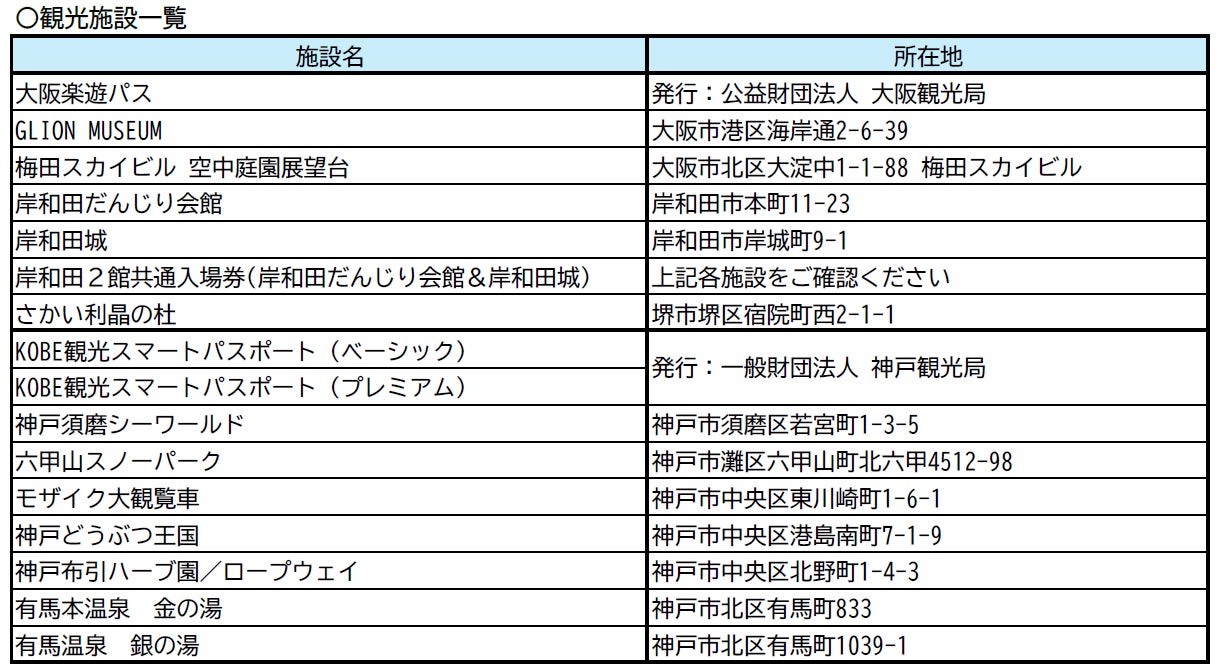 本商品では、大阪周遊コースと神戸周遊コースの2コースを設定しております。また、神戸須磨シーワールド、神戸どうぶつ王国、梅田スカイビル 空中庭園展望台など16の観光施設入館券とのセットプランの販売(複数同時購入可能)も実施します。セットプランを購入いただくと阪神高速おでかけパスがさらに200円引き(普通車)となり大変お得です。また、お申込み特典として、提携施設約50ヵ所(大阪・兵庫等の地域)でご利用いただけるお得なクーポンをご用意しております。