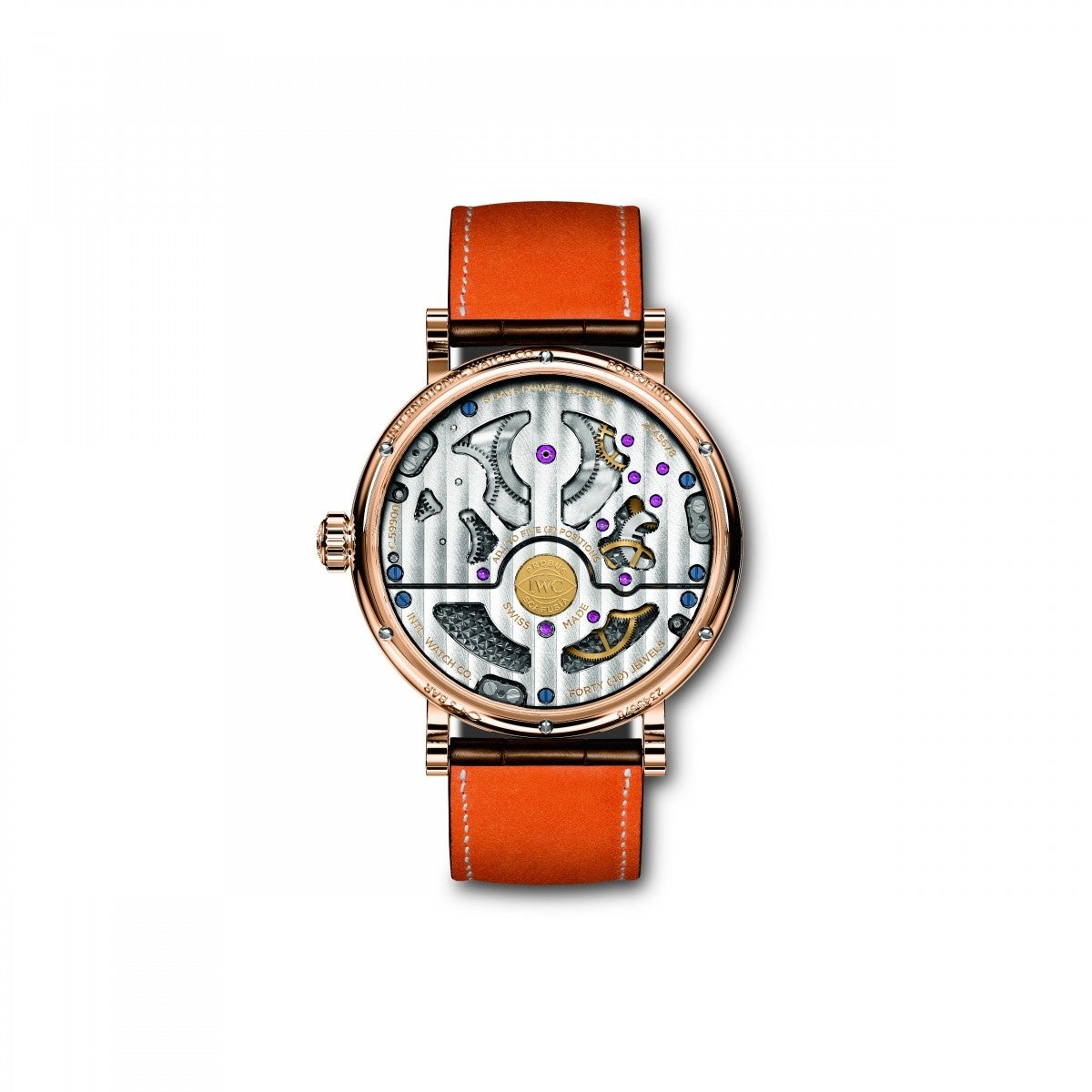 ポートフィノとして初めてトゥールビヨンを搭載したモデルです。テンプ、アンクル、ガンギ車がケージに収められ、1分間に1回転します。この絶え間ない回転は、重力の影響を打ち消し、時計の精度に悪影響を与えないようにするのに役立ちます。ハッキング・トゥールビヨンにより、時計を秒単位で正確に設定することができます。また、ダイヤモンドコーティングされたシリコンを使用して部品を製造することで、摩擦を低減しました。これにより、IWCの手巻き式キャリバー59900で達成された8日間のパワーリザーブに大きく貢献しています。文字盤には、フライング・ミニッツ・トゥールビヨンに加え、レトログラード式の日付表示とパワーリザーブ表示が配されています。直径45ミリメートルのケースは18Kレッドゴールド製です。サファイアガラス製の裏蓋からは、ジュネーブストライプで装飾されたキャリバーを眺めることができます。