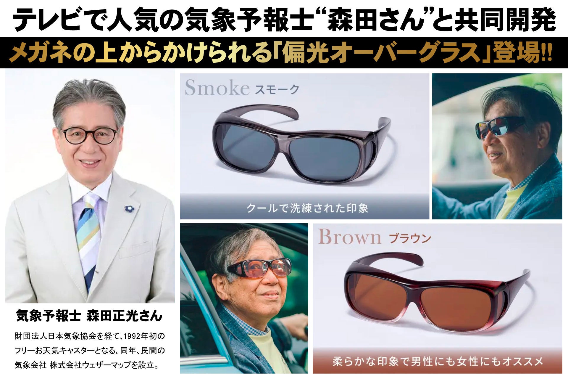 お茶の間で人気の気象予報士“森田さん”と共同開発のメガネの上からかけられる「偏光オーバーグラス」登場!!