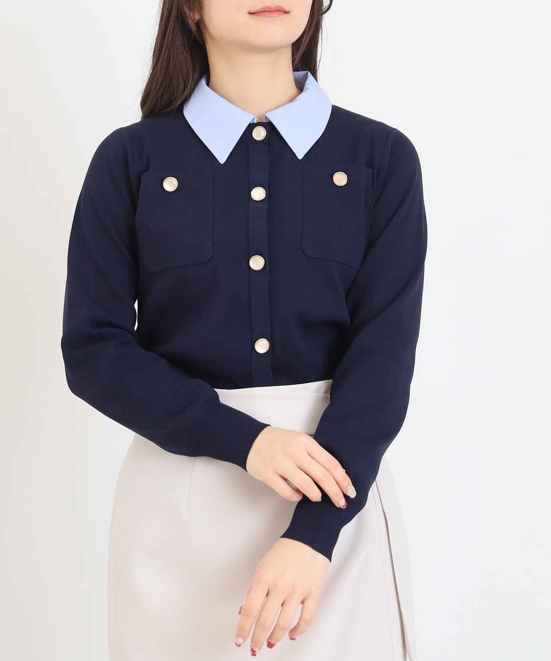 オフィスにも取り入れやすいシンプルなデザインに、ちゅるんとしたボタンをあしらうことでエレガントさをプラス。羽織るだけで上品な印象に仕上がります。