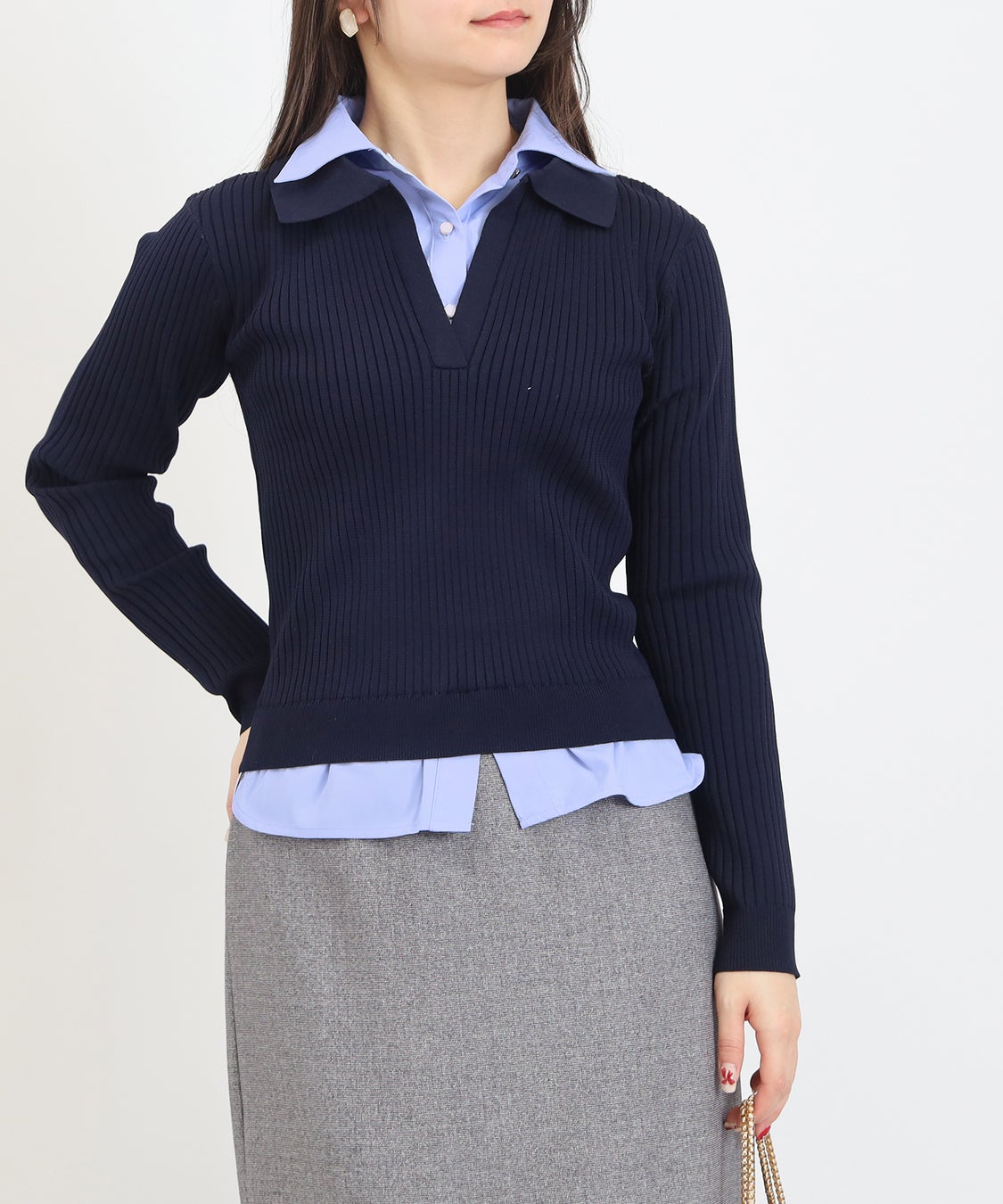 重ね着しなくてもレイヤードスタイルを楽しめるシャツ×ニットのイミテーションデザインです。