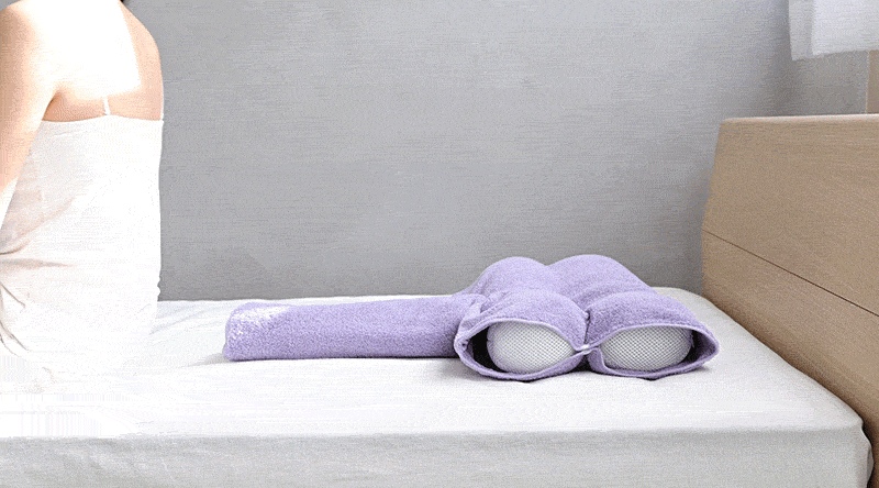 枕本体は頭を支え、首や肩へかかる圧力を分散させること、また枕自体の高さを簡単に変えるようにし、カバーはストレッチができる縦巻き、肩や背中への圧力を軽減する横巻きの2パターンで使えるように設計しました。