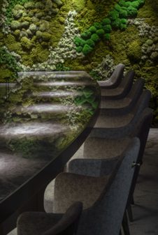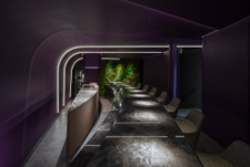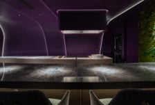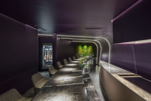 異次元をテーマとした、席数僅か10席のイノベーティブフレンチを楽しむための特別な空間です。グレージュやシャンパンゴールドといった柔らかな色調の1階のウェイティングルームで暫しの時間を過ごした後、階段より2階へ進むと、眼前には紫色の異次元空間が広がります。天井と壁がシームレスに繋がった7枚の紫色のスキンで空間全体が覆われ、それぞれのスキンは重なり合い、そのわずかな隙間に間接照明を仕込み、紫色のスキンを幻想的に照らしています。大胆な模様で弓形の形状をした天然大理石のカウンターの上には、座席数と同じ10灯の小型スポットライトを配置し、その光はカウンター上の料理に焦点を定め照らしています。カウンター正面にはオープンキッチンがあり、シェフが卓越した腕前でフランス料理を調理する様子を楽しむことが出来ます。また、カウンター両側の壁面はドライモスのアートワークで覆い、紫の空間と調和させました。