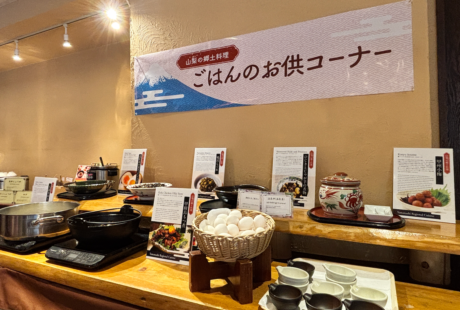 五感で味わう山梨: ほうとうや鳥もつ等の郷土料理から、自家製ポークハム、ホテル特製ローストビーフなど素材にこだわった逸品が並びます。ヒルナンデス!の放映においても取り上げられたお料理をご賞味ください。