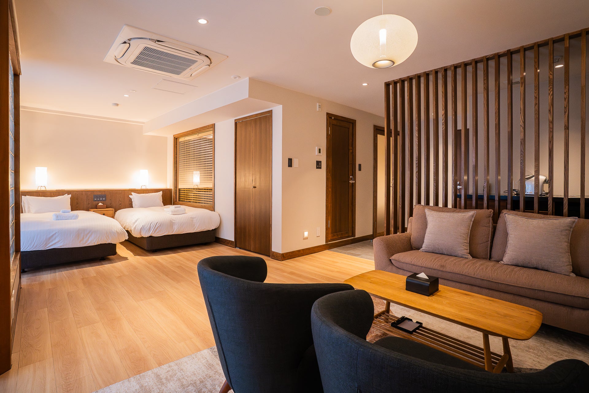 全室66㎡以上のゆとりある間取りに2ベッドルームを配し、最大5名様まで宿泊可能。最新家電を備えたミニキッチンを完備し、快適な連泊が可能です。