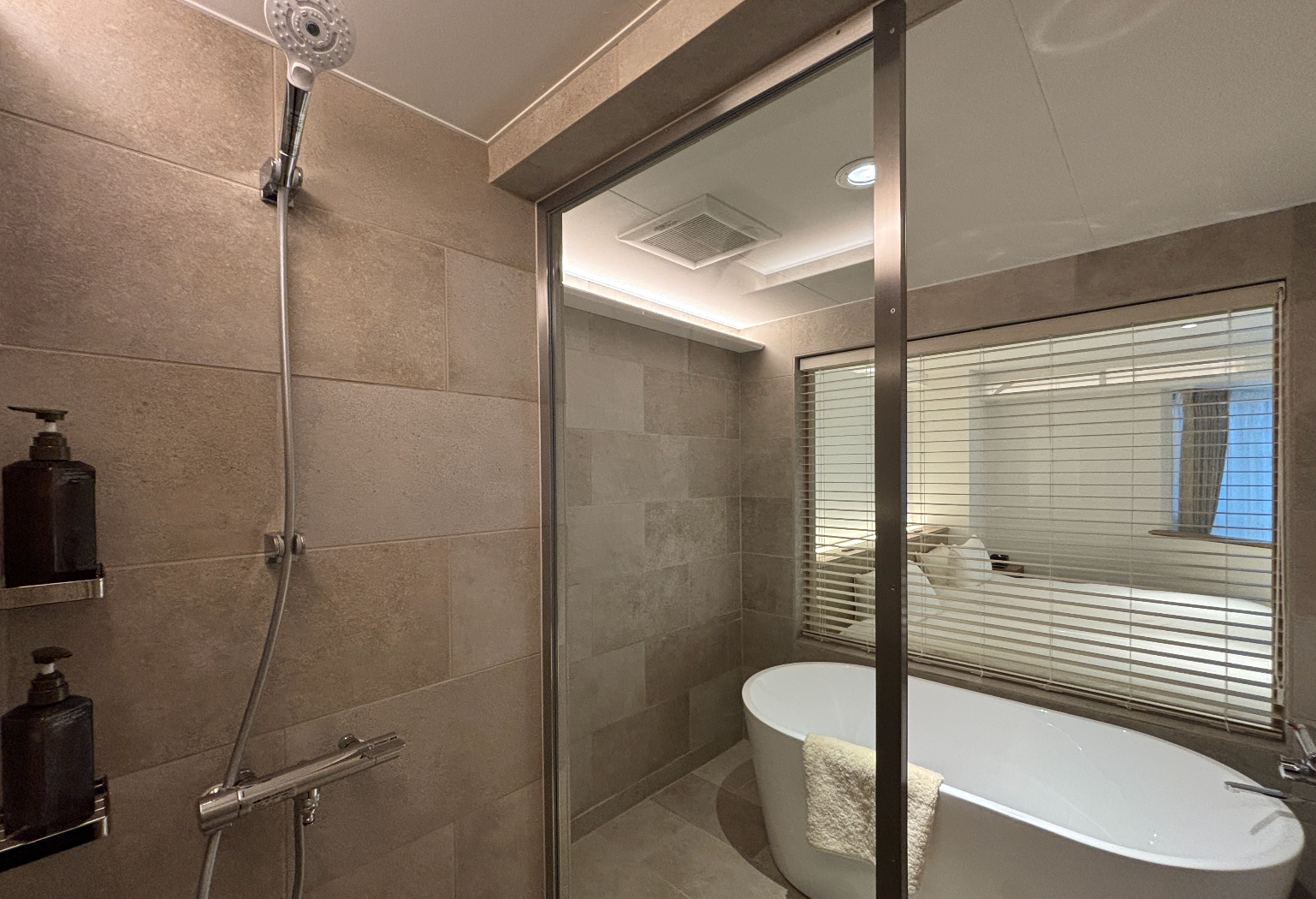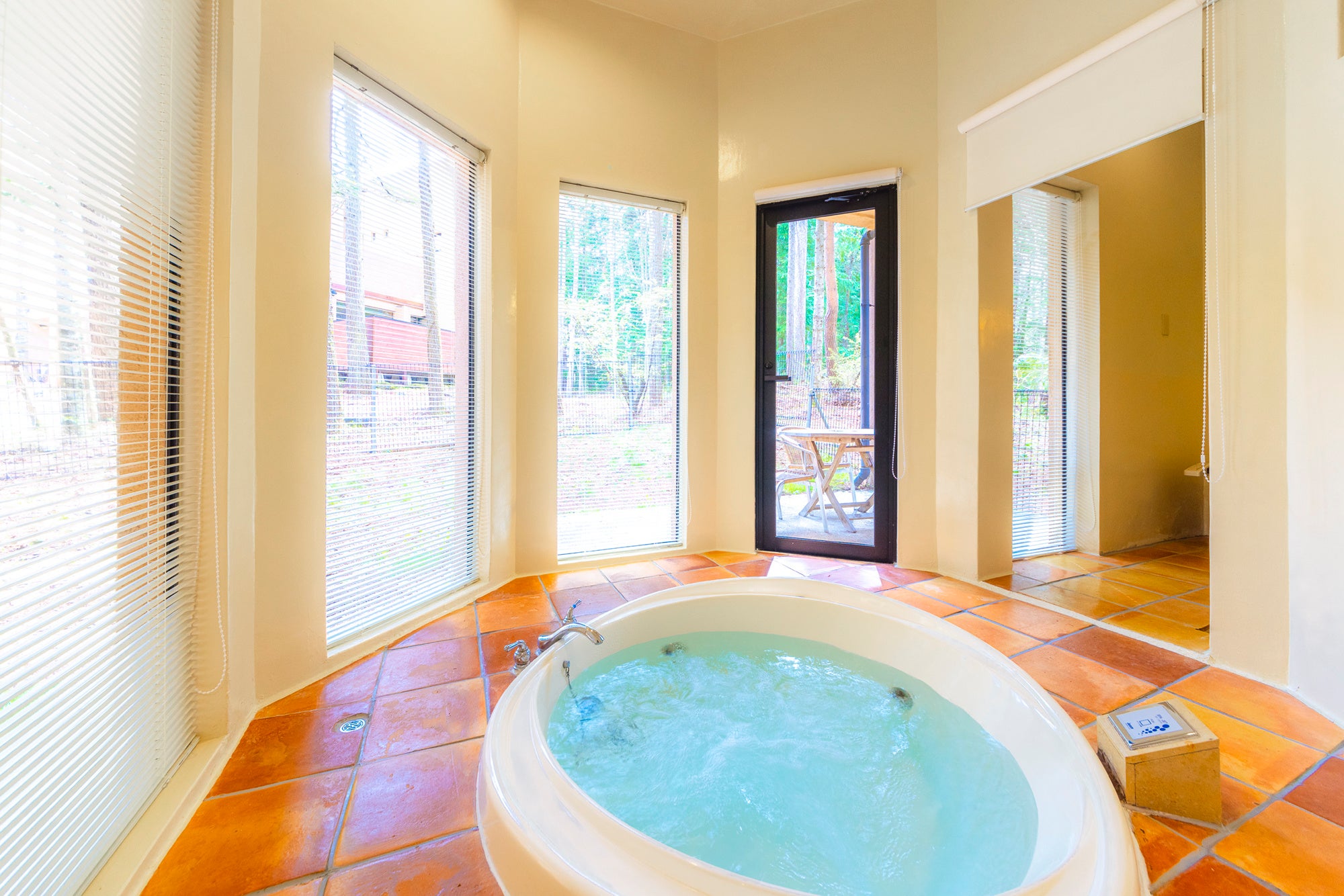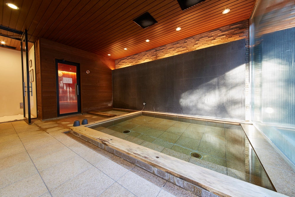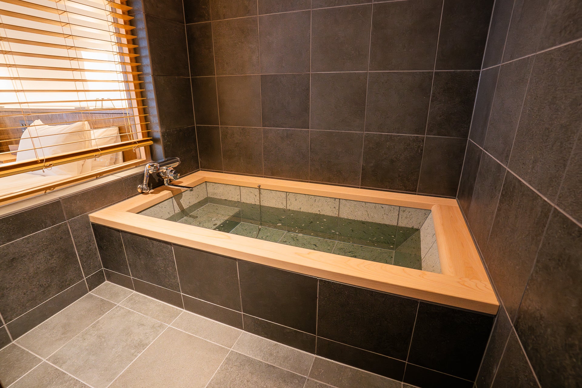 グランデスイート限定: 「檜の石風呂」や「プライベートサウナ」を備え、バスタイムの後は、窓際に配されたスペースで国立公園の清澄な空気と赤松の揺らぎを感じながら、心身が解き放たれる「整い」のひとときを体感してください。