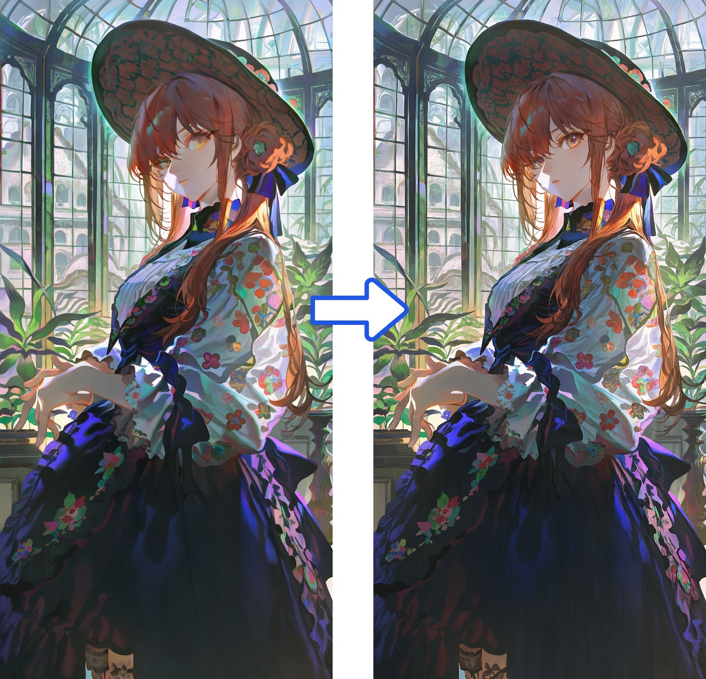 選択した画像をもとに、より大きく精細な新しい画像を生成します。従来の画像よりも解像度が向上し、全体的に鮮明で美しい仕上がりを実現します。多少の違いが生じる場合もありますが、イラストの完成度を大幅に引き上げることが可能です。顔補正