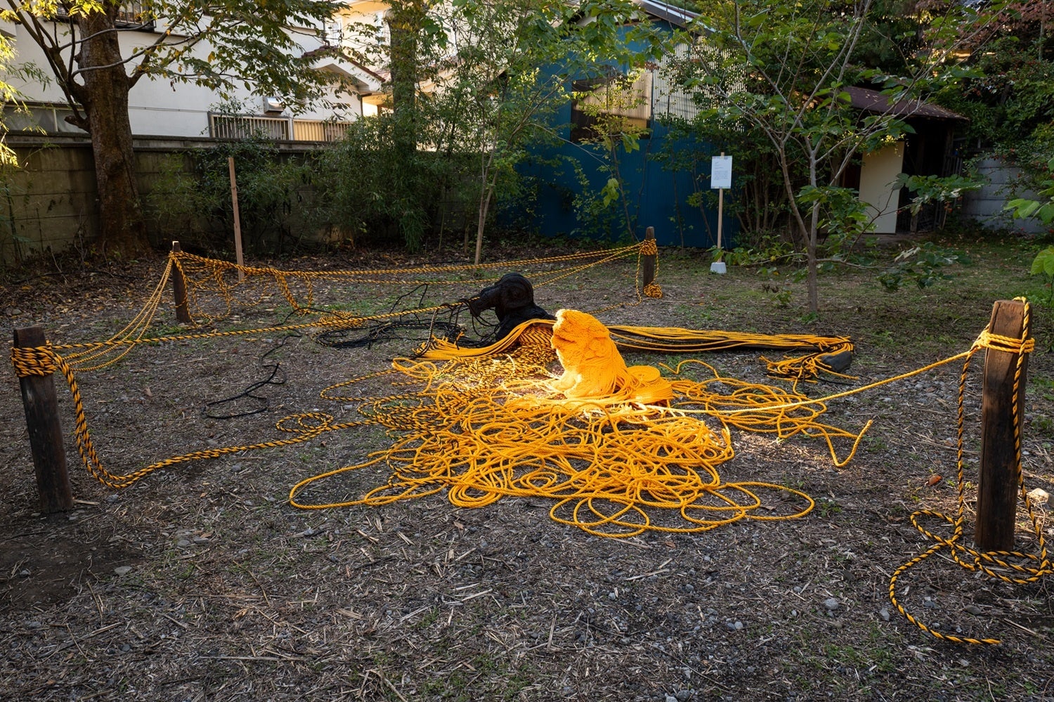 八王子を代表した萩原製糸工場は片倉製糸紡績八王子製糸工場へ移行し、現在は日本機械工業として中野上町に当時の名残を残している。本作品はその敷地内で片倉製糸時代から大切にされてきた諏訪神社の狛犬をモチーフにしたロープの作品だ。作品が設置されている場所はかつて繊維産業の工場として稼働していたとされる工場跡地で、廃墟と化した工場内にはその頃使われていたと思われる机や棚、道具や力織機の動力部などが残され、庭には草木が生い茂っていた。展示会場として芸術祭のためにひらかれたその場所で、養蚕に携わる人々を見守った狛犬が鑑賞者を出迎える。