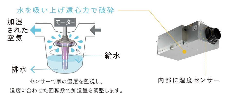 加湿装置のオプションもご用意 : 「遠心粉砕方式」の加湿装置なので、カビの心配がなくなりました。アクアシッターは「遠心破砕方式」で加湿量をコントロール。加湿フィルターがない気化式かつ、水道と接続する自動給排水のため、メンテナンスの手間を軽減します。加湿中は24時間に1度、タンクの排水と乾燥運転を行い、新しい水に入れ替えます。夏場など使用しない季節は1週間に1度、新しい水で洗浄運転と排水、乾燥運転を実施。定期的に内部清掃を行います。