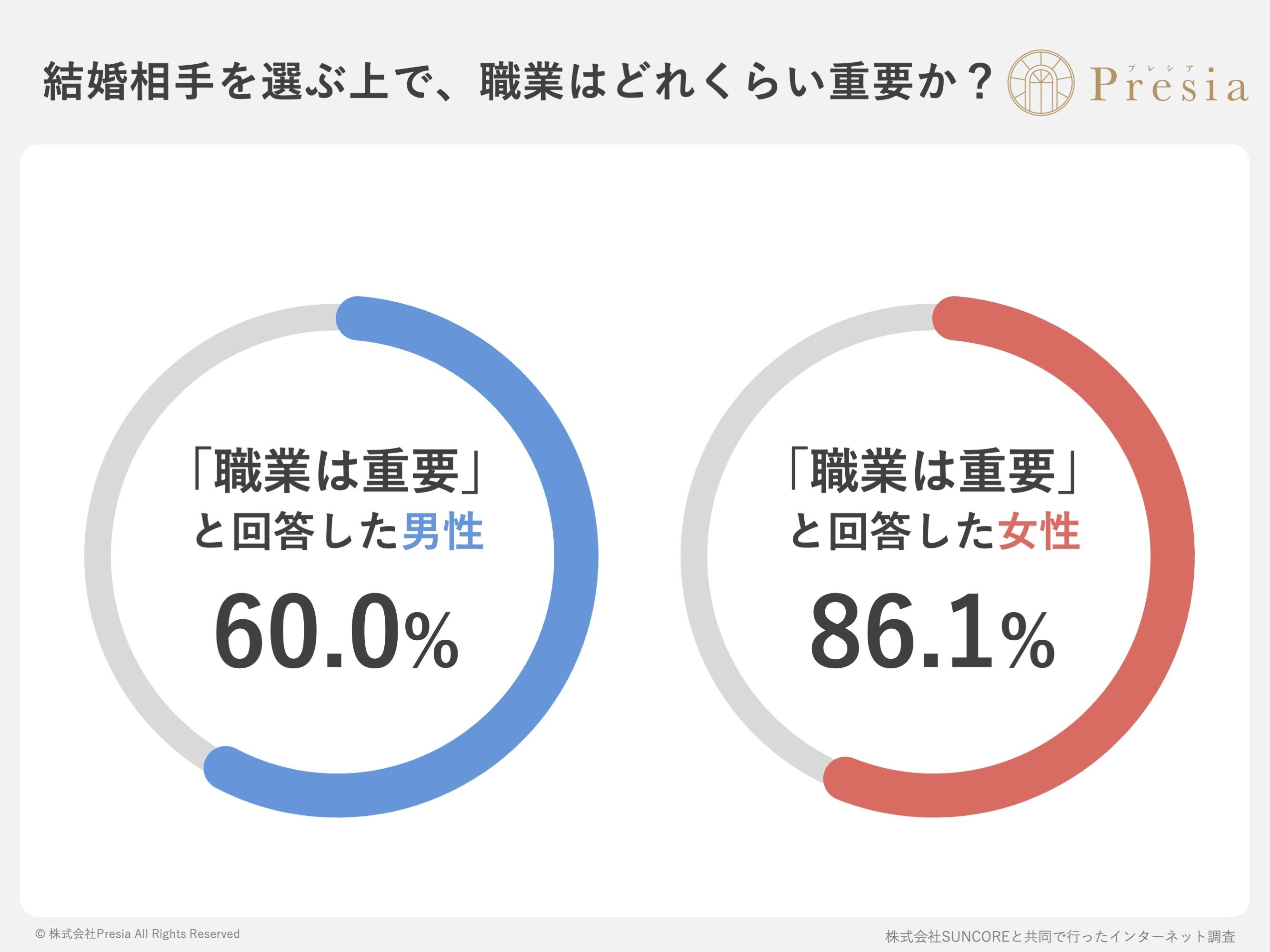 「職業は重要」と回答した女性は86.1%。一方、男性は60.0%に留まり、女性の方が相手の職業をシビアに見ている実態が浮き彫りに
