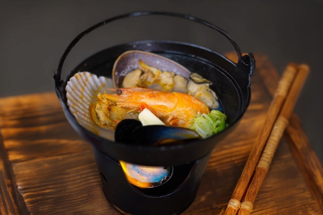 芳醇な吟醸酒で新鮮な魚介をふっくらと蒸し上げ、素材本来の香りと甘みを最大限に引き出した看板料理です。鍋の中には、牡蠣、ホンビノス貝、帆立、有頭エビといった豪華な具材がふんだんに入っており、見た目も非常に華やかです。