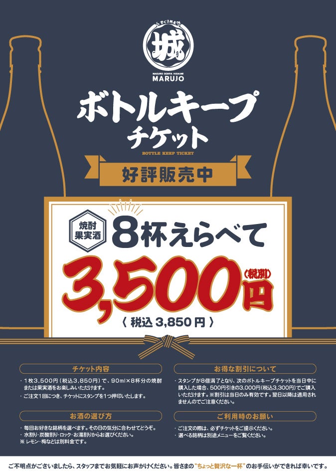 バリエーション豊かな焼酎を取り揃えています。食事の味わいを深めるためには、料理に寄り添うお酒の存在が不可欠です。ユニークなサービスが、焼酎・果実酒のボトルキープチケットです。3,500円(税別)キープチケットを購入し、8杯分(720mlボトル1本相当)の焼酎・果実酒を自由にオーダー出来ます。単品オーダーよりもお得なメガサイズで提供。