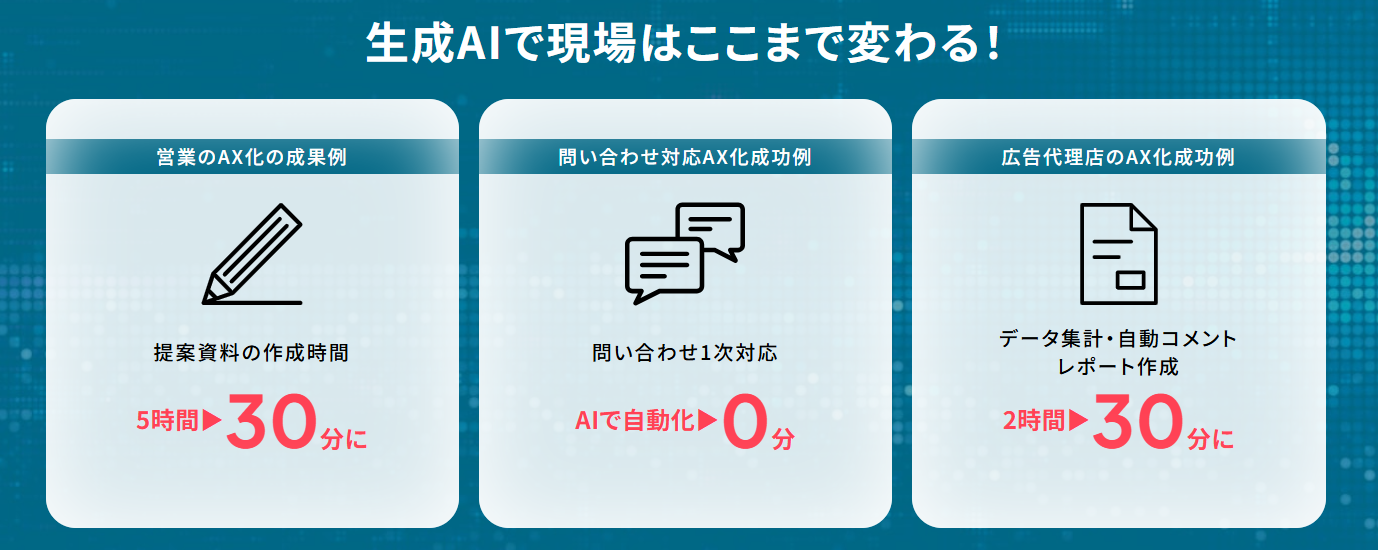 現在、生成AIの進化スピードは極めて速く、自社単独で最新情報を追い続けながら、自社業務に適した活用方法を見極めることは容易ではありません。 また、多くの企業では、生成AIをチャットUI上で検索代替や壁打ち用途として活用する段階には入っている一方で、業務フローや制作・分析・資料作成といった実務にまで組み込み、継続的な生産性向上へつなげられているケースは限定的です。