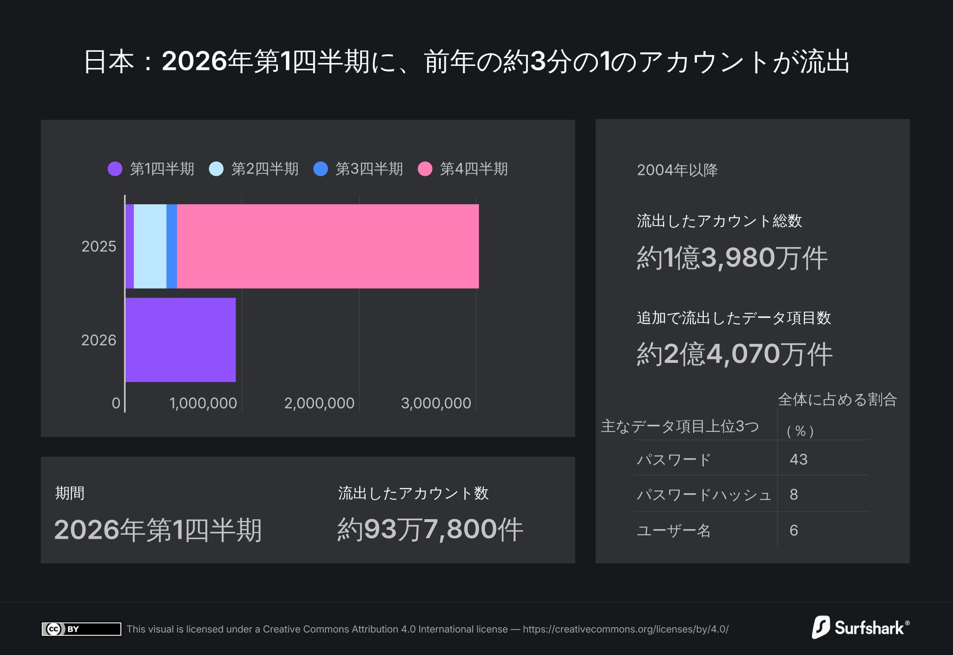 2026年第1四半期に日本で流出したアカウントは93万7,800件に達し、累計は1億3,980万件という驚異的な規模に達しました。