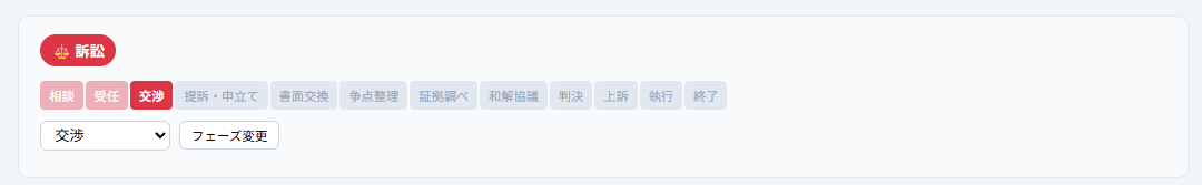 訴訟では「事件番号」「裁判所」「原告」「被告」、交渉では「依頼者側」「相手方」のみ。