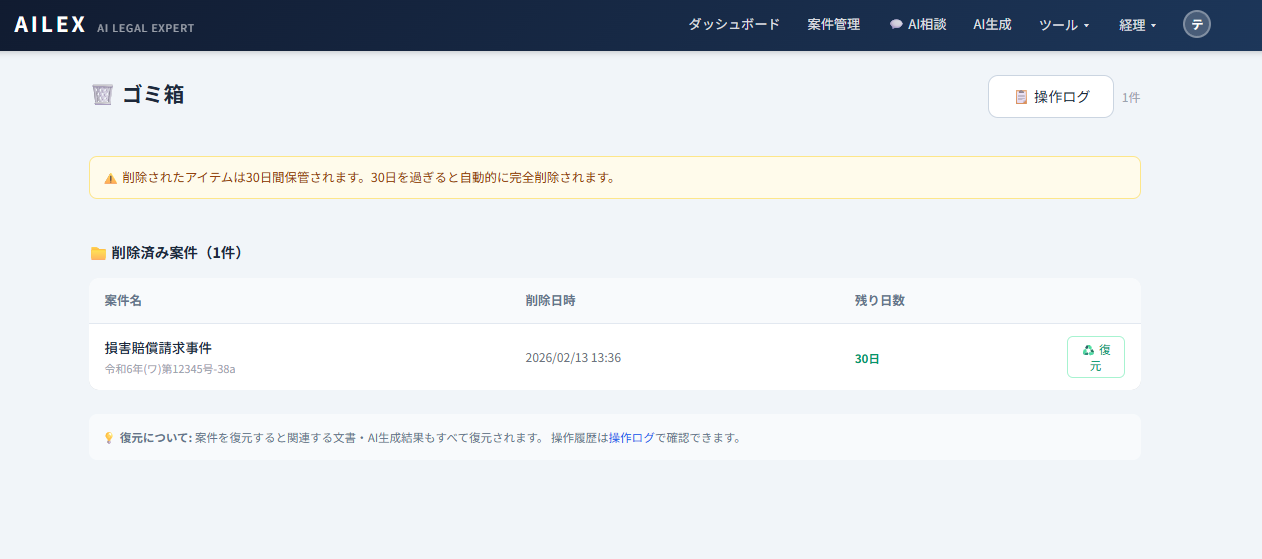 ゴミ箱機能では、削除された事件・文書を30日間保管し、ワンクリックで復元できます。完全削除前に確認ダイアログを表示するため、誤操作による不可逆的なデータ喪失を防止します。