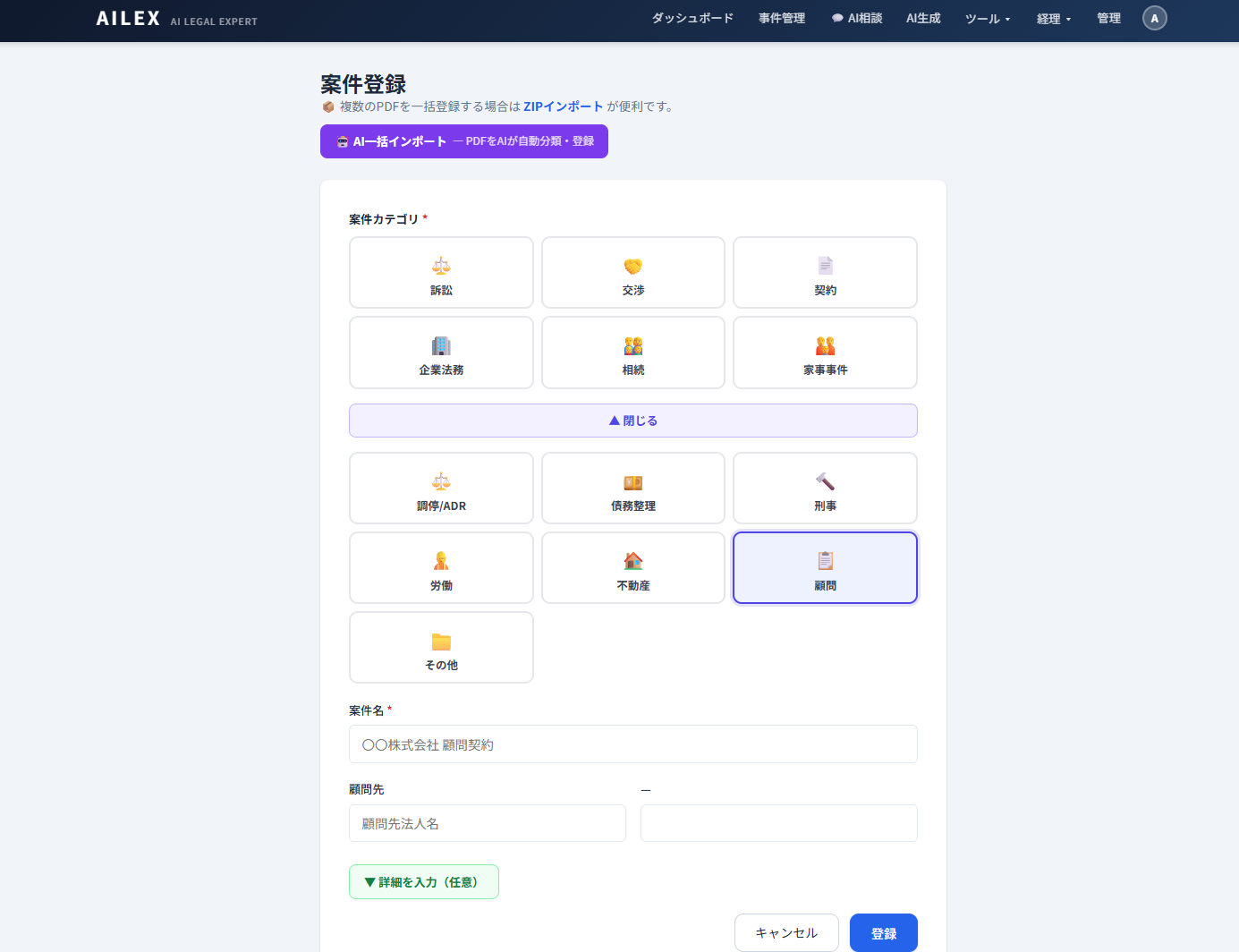 AILEX合同会社(本社:東京都渋谷区 / 顧問弁護士事務所:弁護士法人えそら)は、弁護士事務所向けAI統合型クラウドSaaS「AILEX」において、案件管理を13カテゴリに拡張する「案件管理柔軟化」と、破産・個人再生の申立書類をAIで自動生成する「申立書類AIドラフト」を2026年2月にリリースしました。