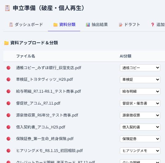 通帳コピー・給与明細・クレジットカード明細等をアップロードすると、AIが16種別に自動分類します。