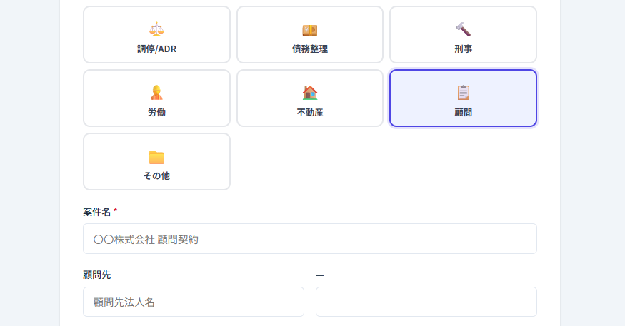 プレースホルダーもカテゴリごとに「損害賠償請求事件」「交通事故示談交渉」「自己破産申立」等に切り替わります。