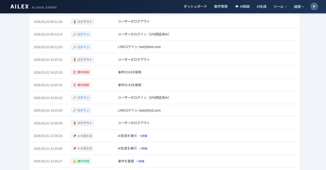 操作ログビューワでは、事件の登録・編集・文書のアップロード・AI生成・削除といった全操作が、タイムスタンプ・操作者・IPアドレスとともにタイムライン形式で表示されます。「いつ、誰が、何をしたか」を弁護士自身がいつでも確認できる仕組みです。