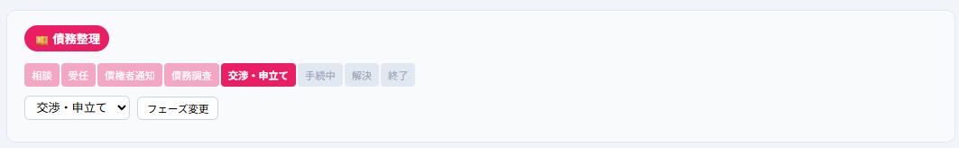 案件カテゴリが「債務整理」の場合に「申立準備」タブが自動表示され、6画面で作業が完結します。