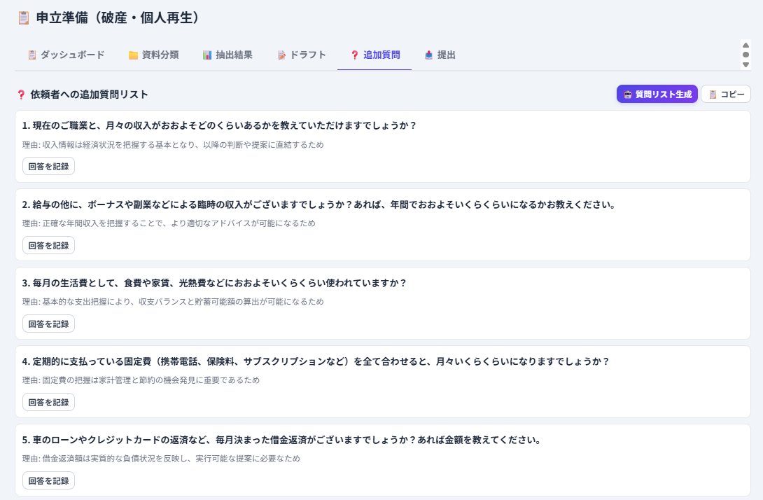 不足情報や矛盾点から依頼者への質問リストを自動作成し、ヒアリング漏れを防ぎます。