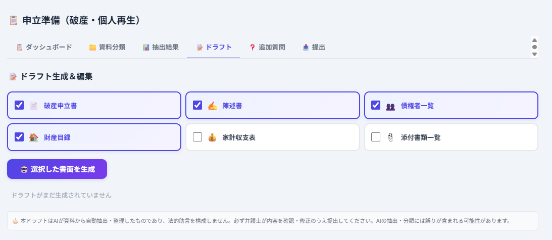 申立書類AIドラフトはAI補助ツールとして法的判断を行わず、全ドラフトに免責表示を付与、全操作を監査ログに記録しています。