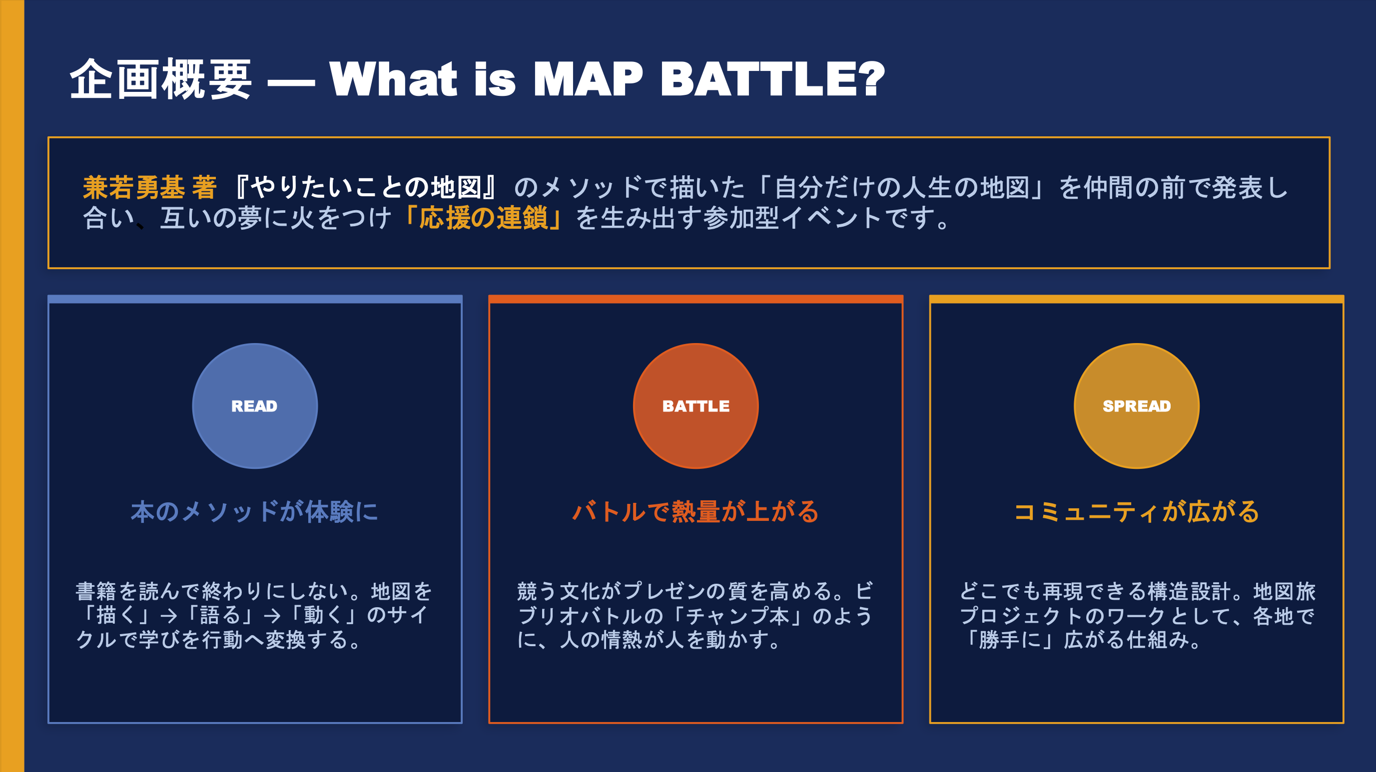 MAP BATTLEは、自分だけの「人生の地図」を描き、仲間の前で3分間ピッチ発表し合うコミュニティ拡散型のワーク企画です。